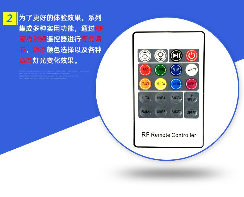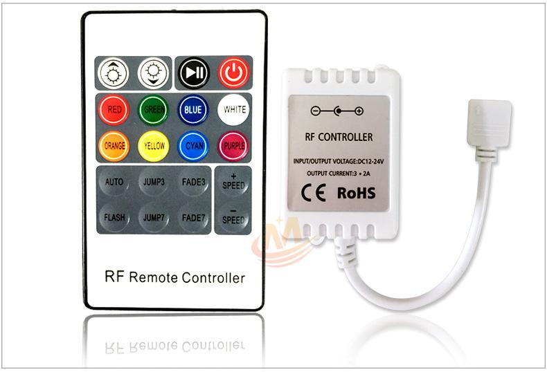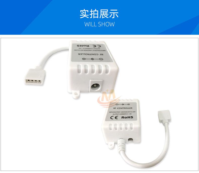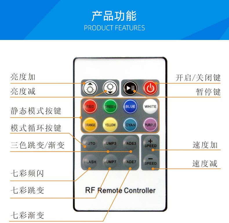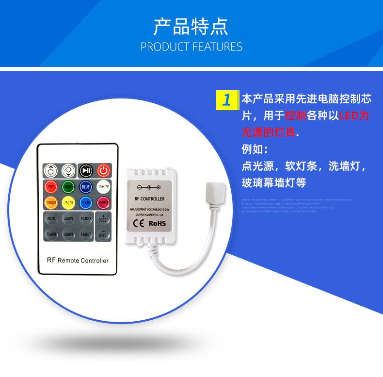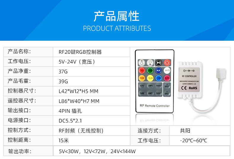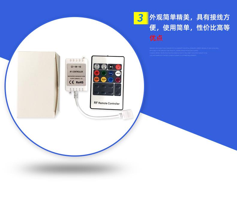 Controlador RGB de 20 teclas RFAdopta tecnología avanzada de control PWM (modulación por ancho de pulso), y su control remoto utiliza un control remoto RF.No restringido por dirección u obstáculos, el control remoto es efectivo dentro de la distancia efectiva. La entrada de energía utiliza un conector hembra de CC, y la salida utiliza un conector hembra de 4 pines, que tiene cuatro conectores +GRB, y se puede enchufar al header de 4 pines. Este producto puede seleccionar modos, ajustar el brillo, ajustar la velocidad y otras funciones según los requisitos del cliente, y puede lograr efectos de luz como salto, degradado y estroboscópico;RFEl controlador de 20 teclas tiene las ventajas de cableado fácil, uso sencillo y precio asequible.