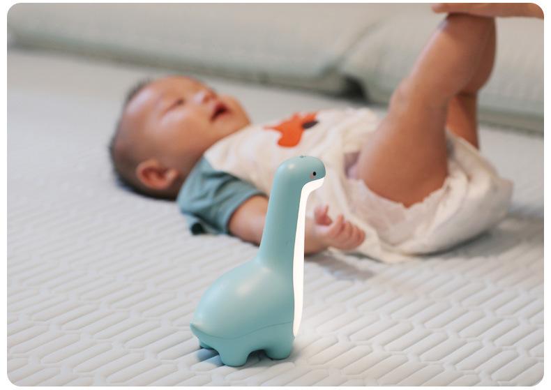 La luz nocturna de dinosaurio está hecha de materiales ABS y HIPS de alta calidad, con almohadillas de silicona aptas para uso alimentario. El largo cuello del dinosaurio ilumina el pecho. En la parte posterior hay un interruptor táctil que permite ajustar el brillo con una pulsación prolongada. Haz doble clic en el interruptor para activar el temporizador de 15 minutos. Conéctalo y actívalo antes de usarlo.
