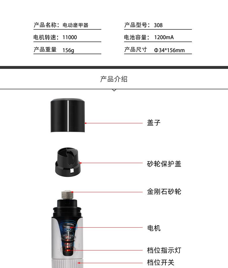 Acessórios padrão: moedor de unhas * 1 PCS Cabo de carregamento USB * 1 PCS manual de instruções * 1 PCS
