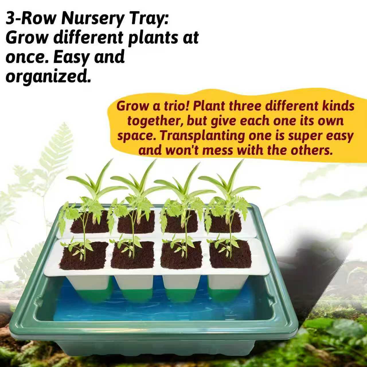Esta es una combinación de bandeja para plántulas + celdas de silicona para plántulas de nuevo diseño. El silicona utiliza un diseño de material de celda para plántulas completamente nuevo, con cuatro agujeros por grupo, y se pueden empalmar tres grupos en 12 agujeros, lo que facilita a los clientes clasificar las plantas y extraer fácilmente las plántulas para trasplantar. No requiere sacar toda la maceta, se puede reciclar, protege el medio ambiente y ahorra costos de plántulas. La bandeja para plántulas adopta un diseño de tapa alta con hebillas, permitiendo que las plántulas crezcan más altas. Para más detalles, por favor consulte a través de Wangwang.