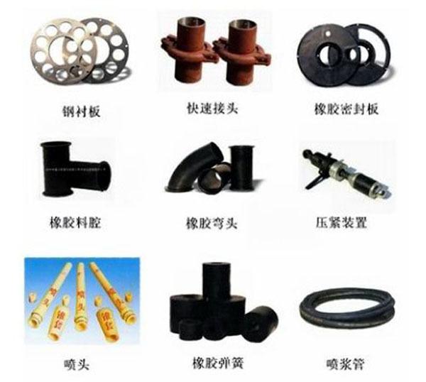 Os acessórios da máquina de concreto projetado incluem: revestimento de aço, bico, câmara de material, tubo de concreto projetado, cotovelo, placa de fricção de borracha, placa de fricção de poliuretano, dispositivo de fixação, assento da tremonha, ciclone, revestimento do rotor, tubo de concreto projetado, assento do bico, conector rápido do tubo de concreto projetado, mola do tubo de concreto projetado, revestimento cônico e outros acessórios da máquina de concreto projetado PZ-5.