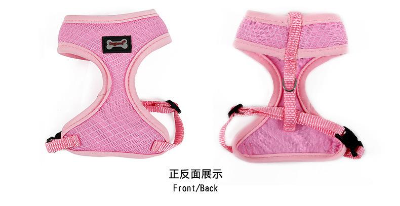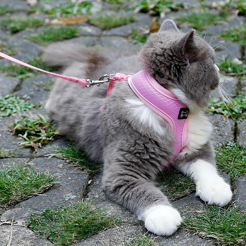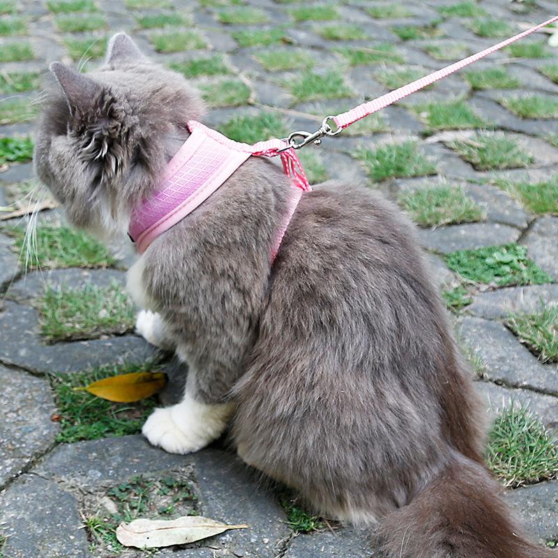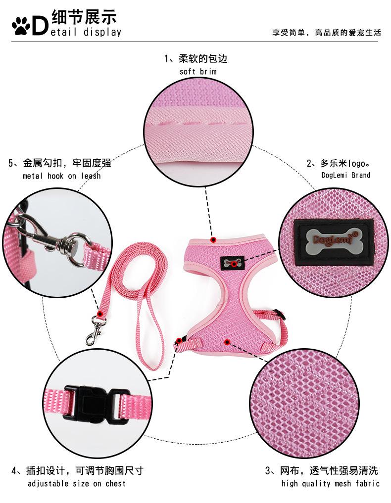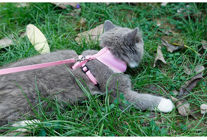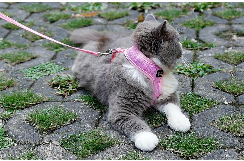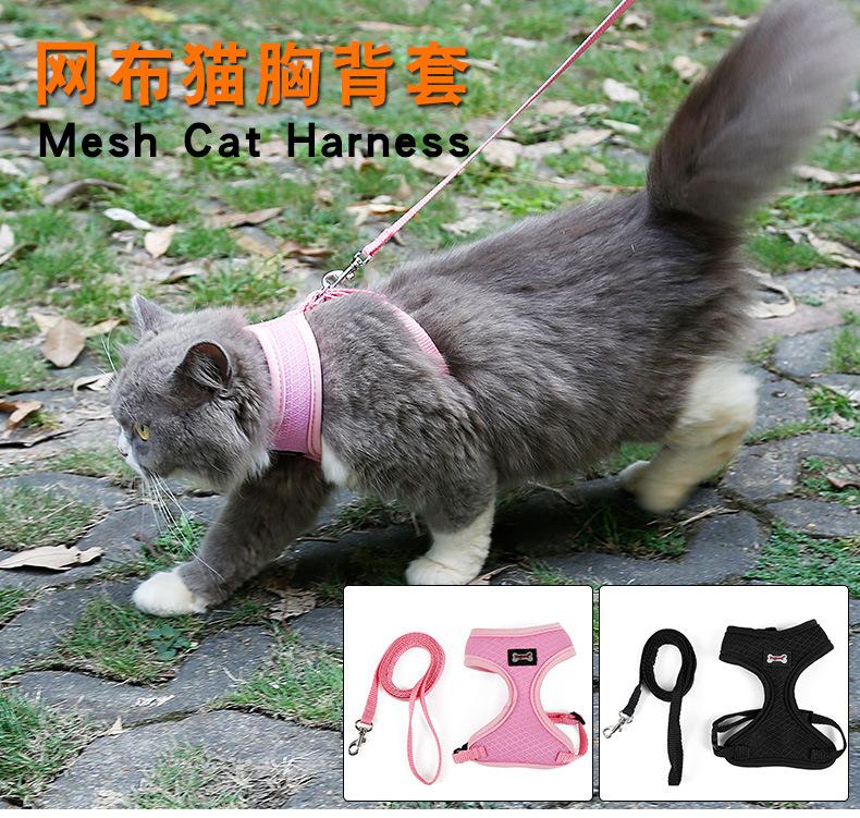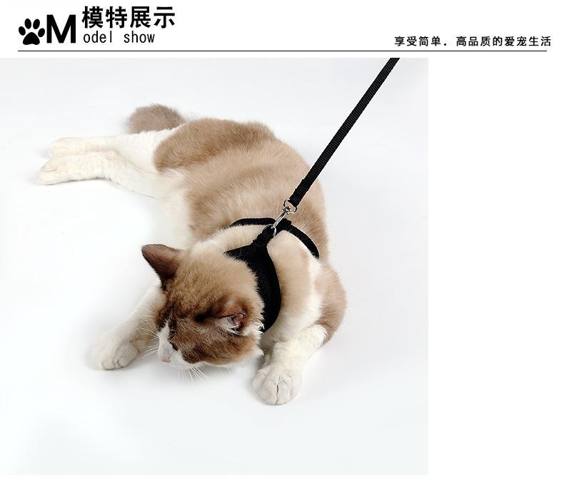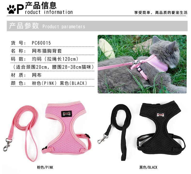 Descrição em chinês: Colete peitoral para gato com rede respirável, corrente guia para gato, colete confortável para animal de estimação, corda de tração para gatinho, corda de puxar para passeio