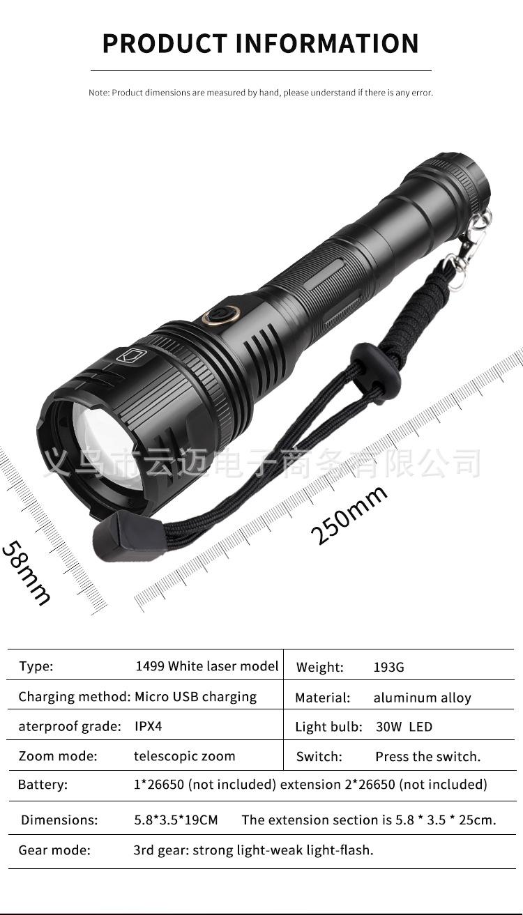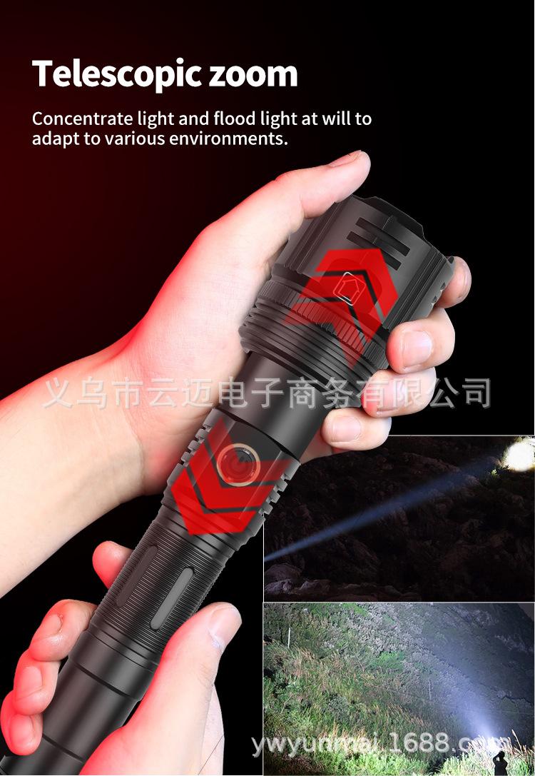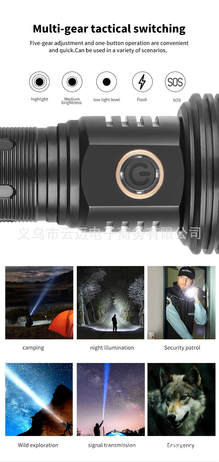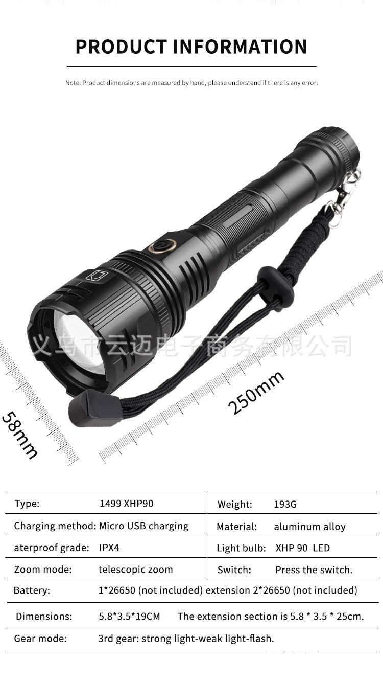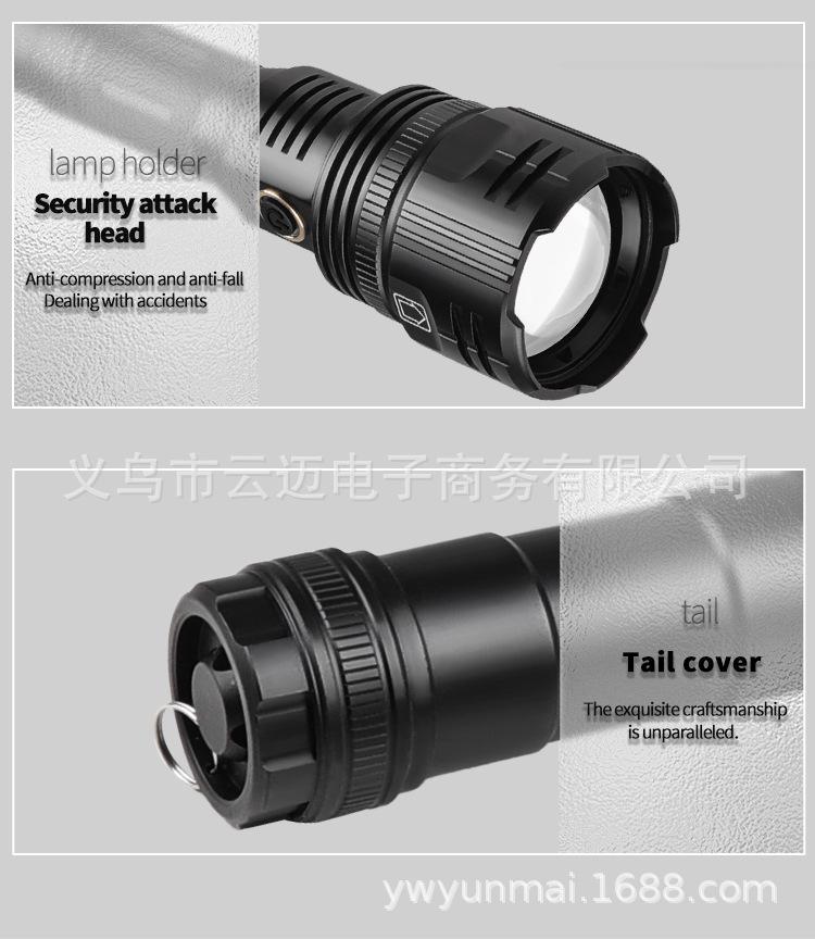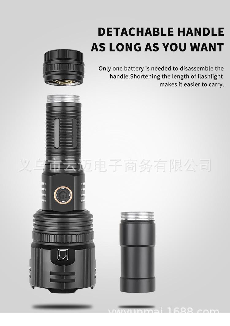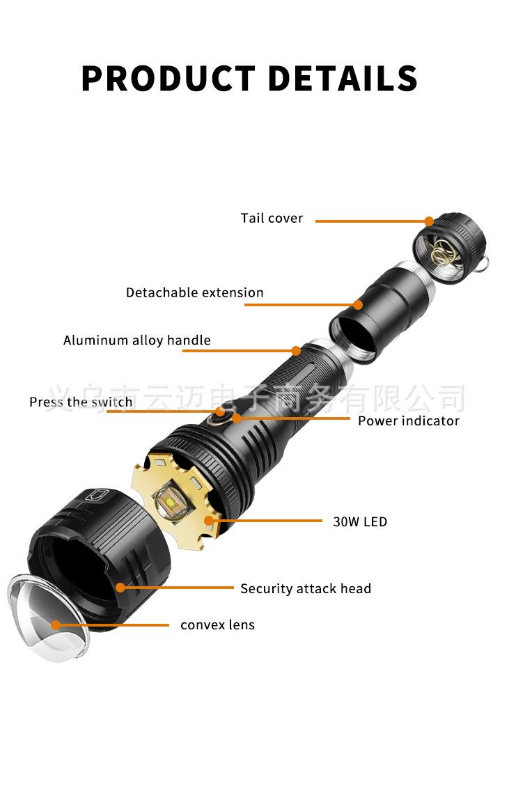 | Características | El diseño de tubo de extensión de la linterna de luz fuerte de súper largo alcance se puede cambiar entre estilos largo y corto para satisfacer diferentes necesidades. La pantalla de encendido es telescópica y con zoom. La superficie está anodizada en duro y es resistente al desgaste sin rayones. |