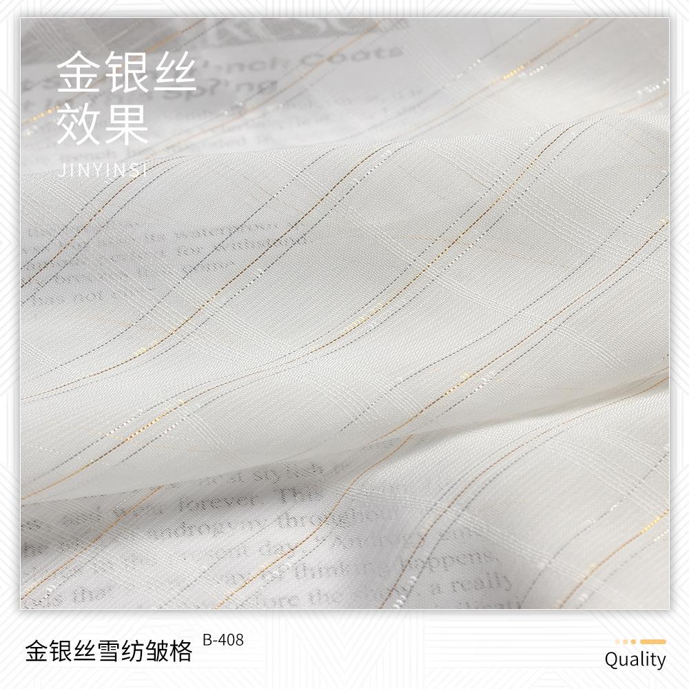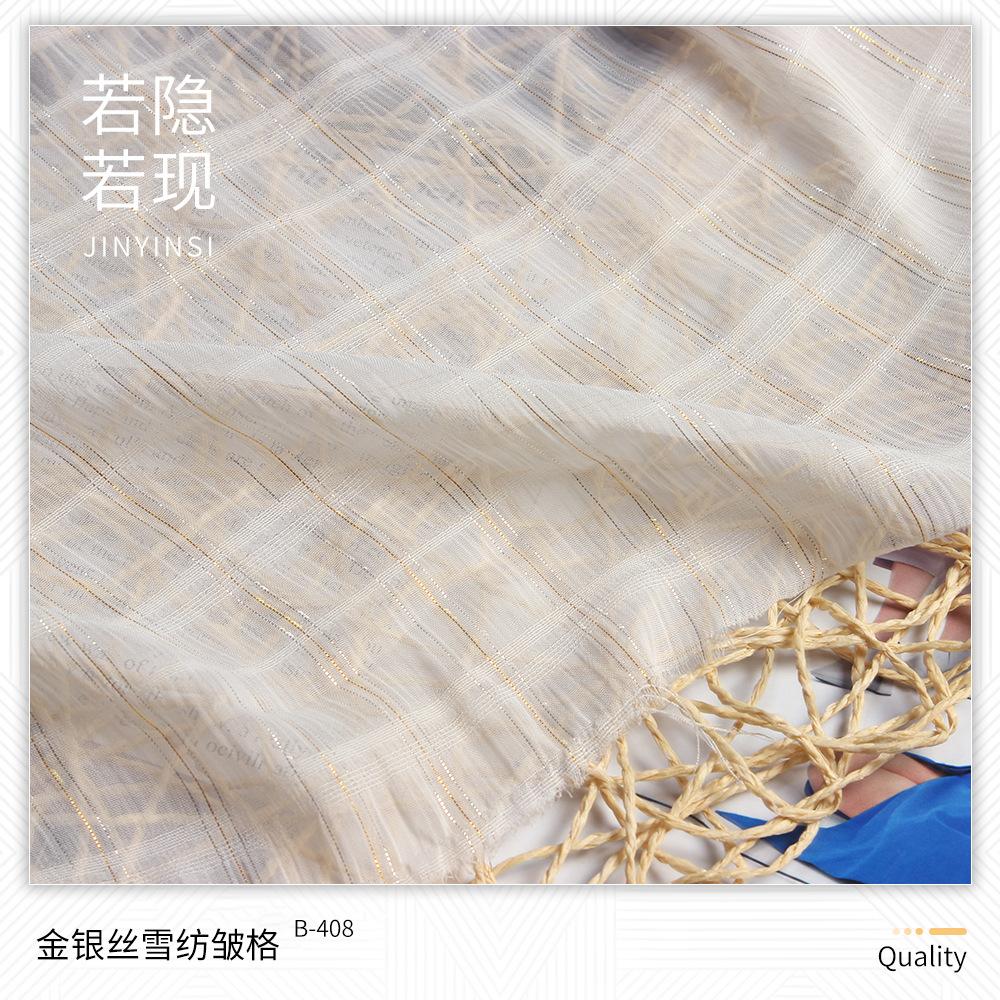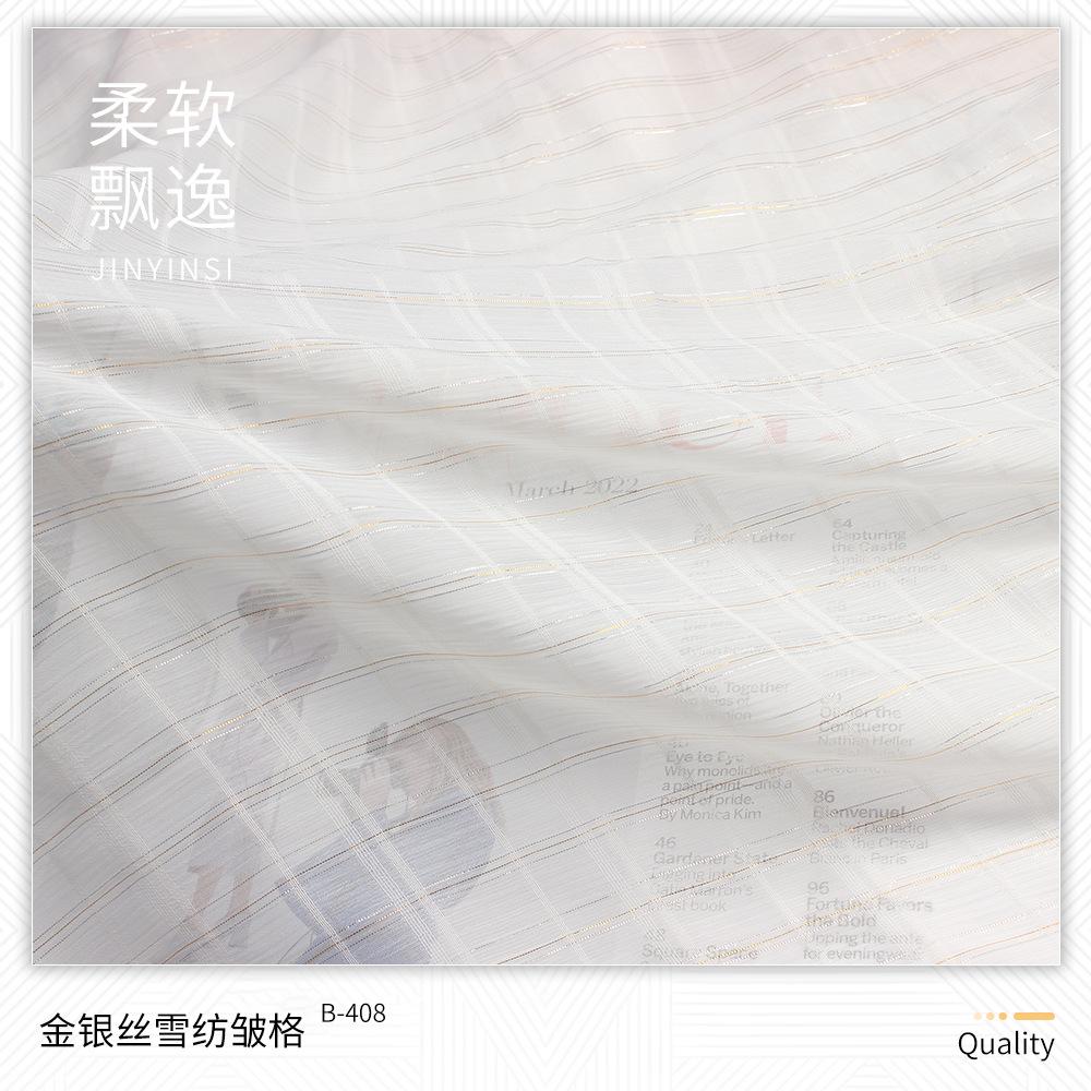 | B-219 | Tecido bolha de ouro 75D | B-401 | Crepe de Chiffon Dourado | B-524 | Lata de areia para lavar roupa | B-708 | 6# seda colorida irregular e linho tecido |