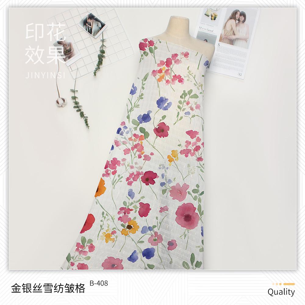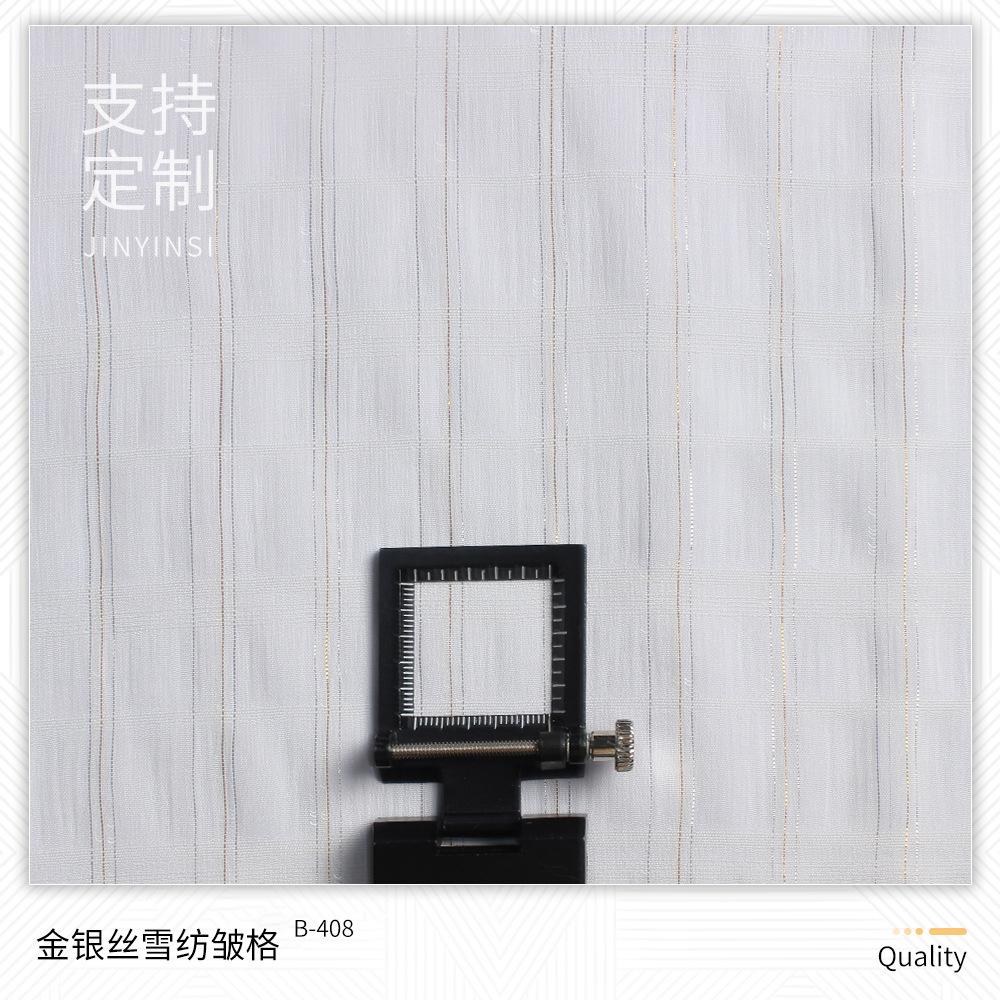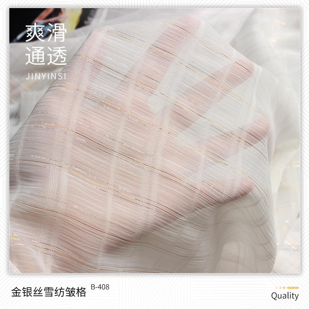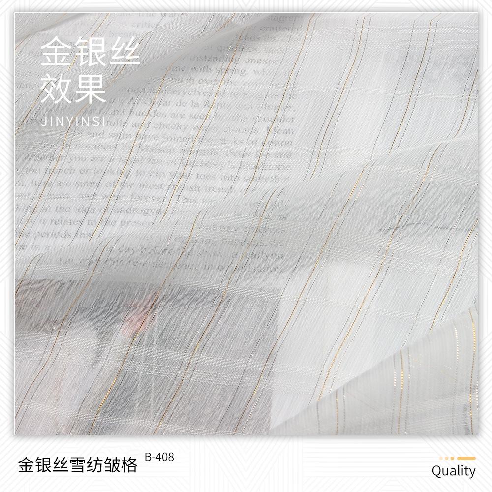 | B-219 | Tecido bolha de ouro 75D | B-401 | Crepe de Chiffon Dourado | B-524 | Lata de areia para lavar roupa | B-708 | 6# seda colorida irregular e linho tecido |