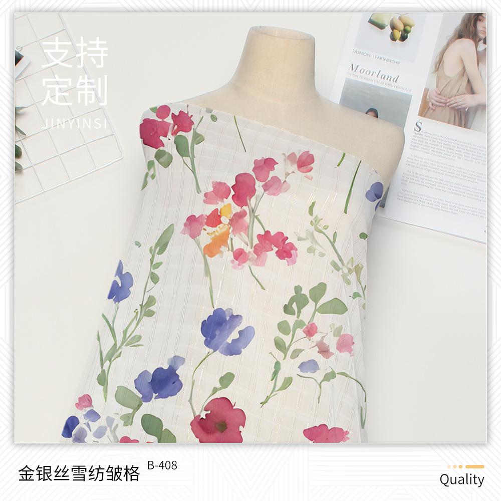 | B-227 | Crepe de chiffon de seda colorido equidistante | B-409 | Seda Dourada Pequena Nº 2 Beauty Stripe Chiffon Crepe | B-603 | Flores coloridas de seda cortada | B-801 | Grau elástico prateado |