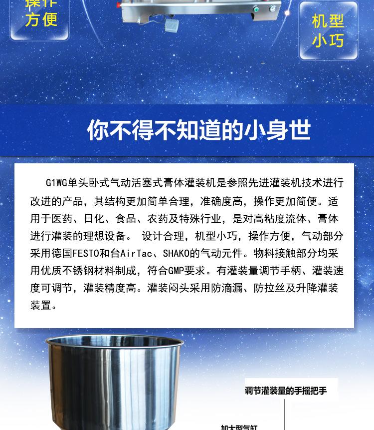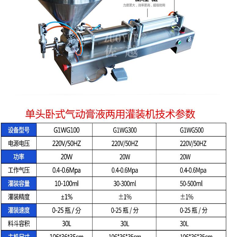 Modelo: Máquina de enchimento de pasta e líquido de dupla finalidade vertical GFA totalmente pneumática, o cilindro, o invólucro e a tremonha são feitos de aço inoxidável, o pistão é feito de politetrafluoroetileno, em conformidade com os requisitos GMP; a máquina usa a fonte de ar do compressor de ar como fonte de energia e tem vantagens óbvias em ambientes de trabalho com condições inflamáveis e explosivas. Além disso, um canudo externo pode ser conectado para enchimento de líquido. O volume de enchimento e a velocidade de enchimento podem ser ajustados, com um pedal e função de enchimento automático, estrutura simples e operação conveniente; é adequado para encher líquidos, pastas e outras substâncias nas indústrias química, alimentícia, química diária, farmacêutica, pesticida, lubrificante e outras.