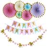 Un juego de guirnalda de unicornio con purpurina de feliz cumpleaños (ancho aproximado de 1.5 metros, ajustable libremente) + 10 globos de unicornio (colores: 4 rojo rosa, 4 blancos, 2 rosas) + un juego de 6 abanicos de papel + un juego de banderines grandes de cumpleaños de cola de pez