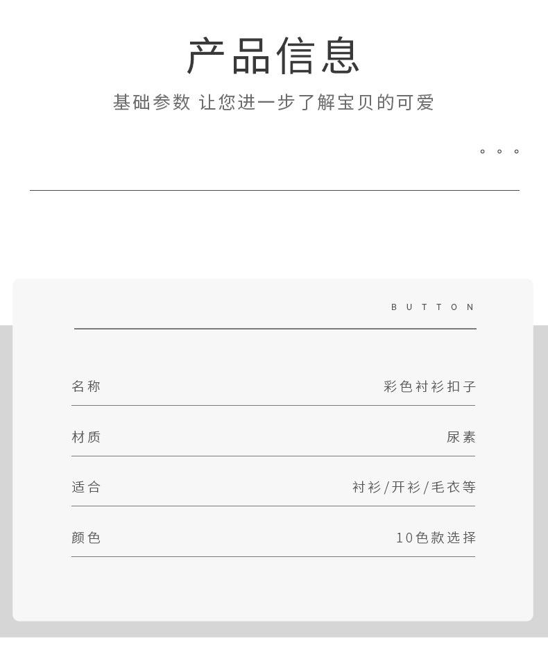 Nossa empresa é especializada na produção e venda de botões de várias especificações. Aceitamos produção personalizada com amostras de clientes e personalização de letras a laser. Para serviços personalizados relacionados, entre em contato com o atendimento ao cliente para negociação. As lojas Alibaba são todas de atacado e não vendidas a granel. Para grandes quantidades, você pode entrar em contato com o atendimento ao cliente para obter descontos. Se precisar comprar amostras, vá até nossa loja Tmall. Melhores votos para os negócios!