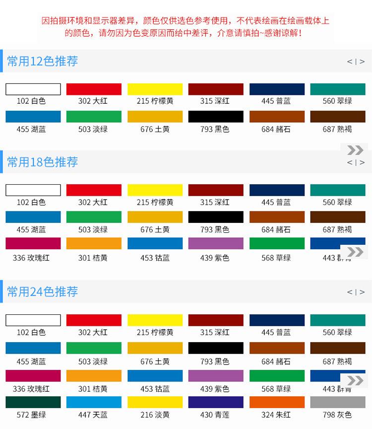 32 cores comumente usadas recomendadas: branco, cor de carne, amarelo claro, amarelo limão, cáqui, amarelo médio, amarelo alaranjado, vermelho brilhante, vermelho alaranjado, vermelho escuro, cinza, vermelhão, vermelho rosa, lótus, roxo, ultramarino, azul, azul celeste, azul cobalto, azul lago, verde claro, verde médio, verde esmeralda, verde amarelo, verde grama, verde oliva, verde escuro, verde escuro, cáqui, ocre, umber queimado, preto