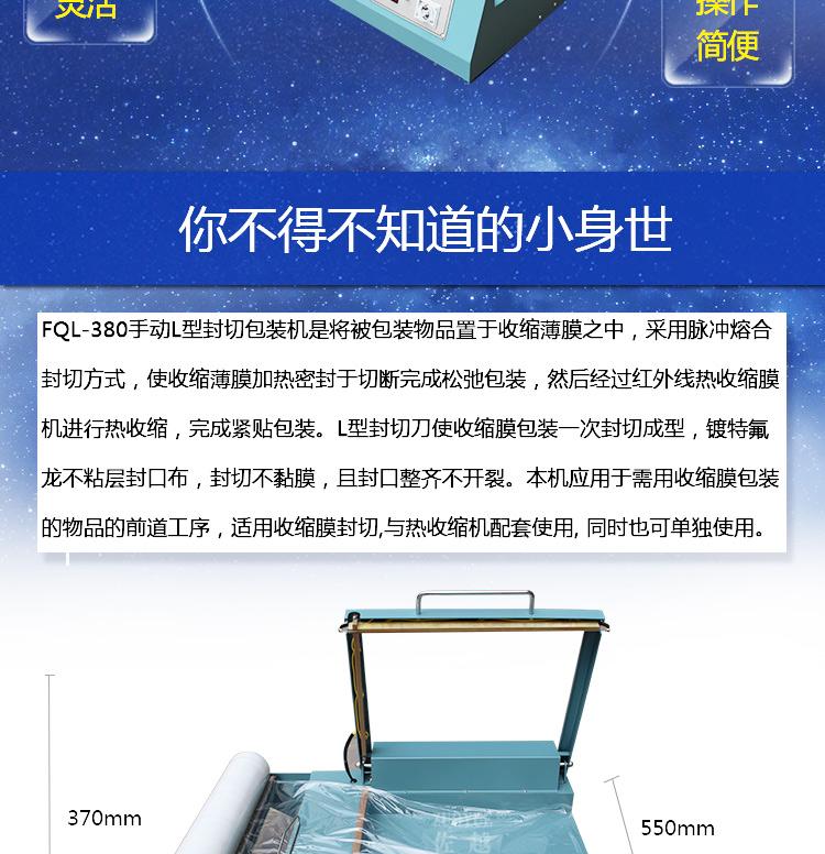 Modelo: Máquina de corte e selagem em forma de L semiautomática/manual/pneumática de plataforma alta de piso FQL-450. A máquina adota faca de selagem de liga antiaderente e resistente ao calor, que não quebra a linha, e a selagem não será carbonizada ou defumada. A correia da faca de selagem é protegida automaticamente para evitar efetivamente o corte errado da embalagem e garantir a segurança do operador. O suporte de filme deslizante pode colocar filmes de várias especificações, e a manivela manual é conveniente para ajustar a altura da correia transportadora. A faca de corte e selagem em forma de L semiautomática/manual/pneumática é geralmente usada como um equipamento de suporte para máquinas de embalagem retrátil, e também pode ser usada sozinha; a faca de corte e selagem em forma de L semiautomática/manual/pneumática pode selar e cortar PE, PP, POF, PVC e outras embalagens de filme retrátil de uma só vez, e o pano de selagem revestido com camada antiaderente de Teflon não grudará no filme ao selar e cortar, e a selagem será limpa e não rachada. Após a selagem e o corte, o produto entra na máquina de encolhimento para completar a embalagem.