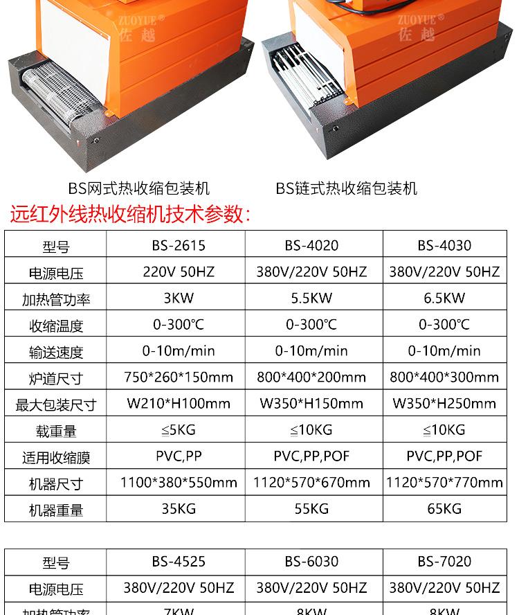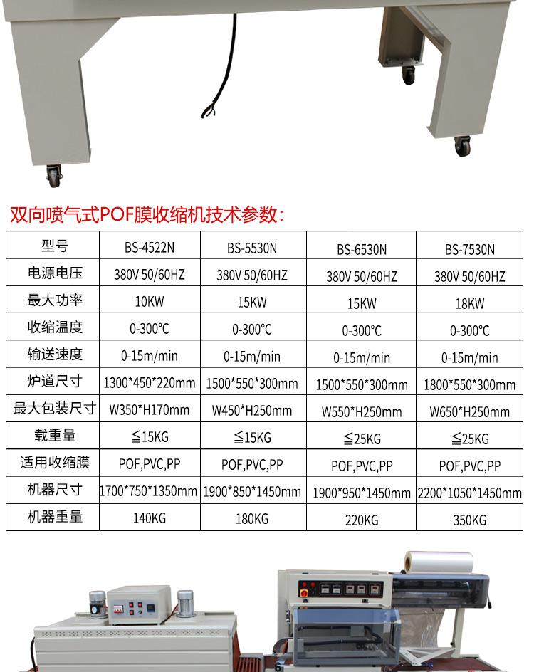 BS-4525AMáquina de embalagem termoencolhível de chão: design avançado de sistema de circulação interna, alto efeito de encolhimento, baixo consumo de energia. Tubo de aquecimento de aço inoxidável, longa vida útil. Transmissão de rolo móvel (pode ser alterada para tipo de rede), velocidade ajustável. Adequado paraPVC/PP/POFContração térmica de filme uniforme.