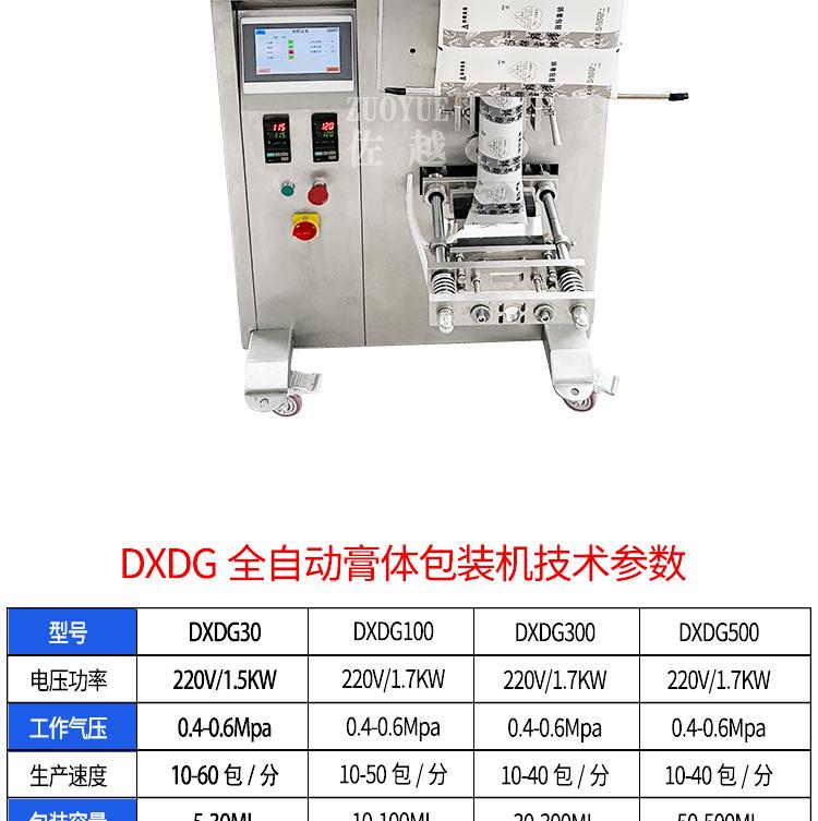 modelo:DXDGLa máquina envasadora de pasta totalmente automática integra llenado, formado, sellado y corte, y adopta materiales de embalaje de película compuesta, lo que tiene una amplia gama de aplicaciones. Esta máquina es adecuada para envasar artículos líquidos o de pasta viscosa con cierta fluidez, como salsa de soya, vinagre, champú y diversas pastas y salsas.