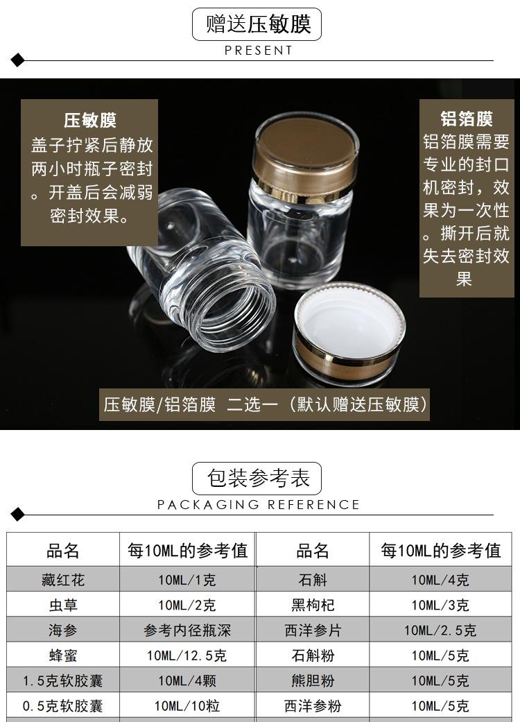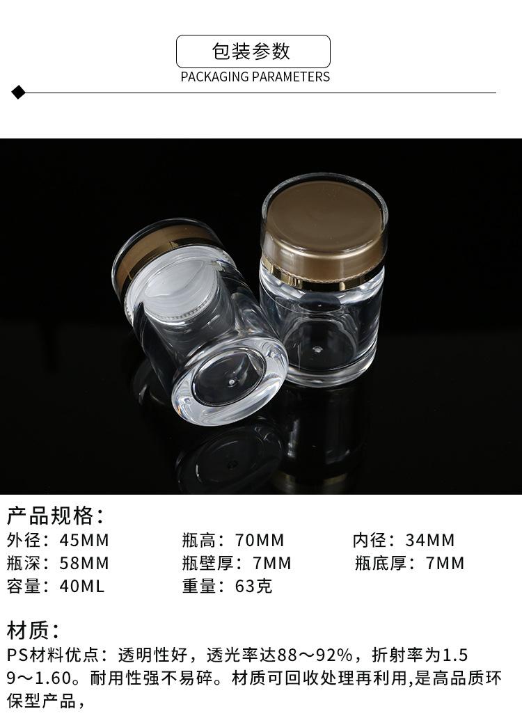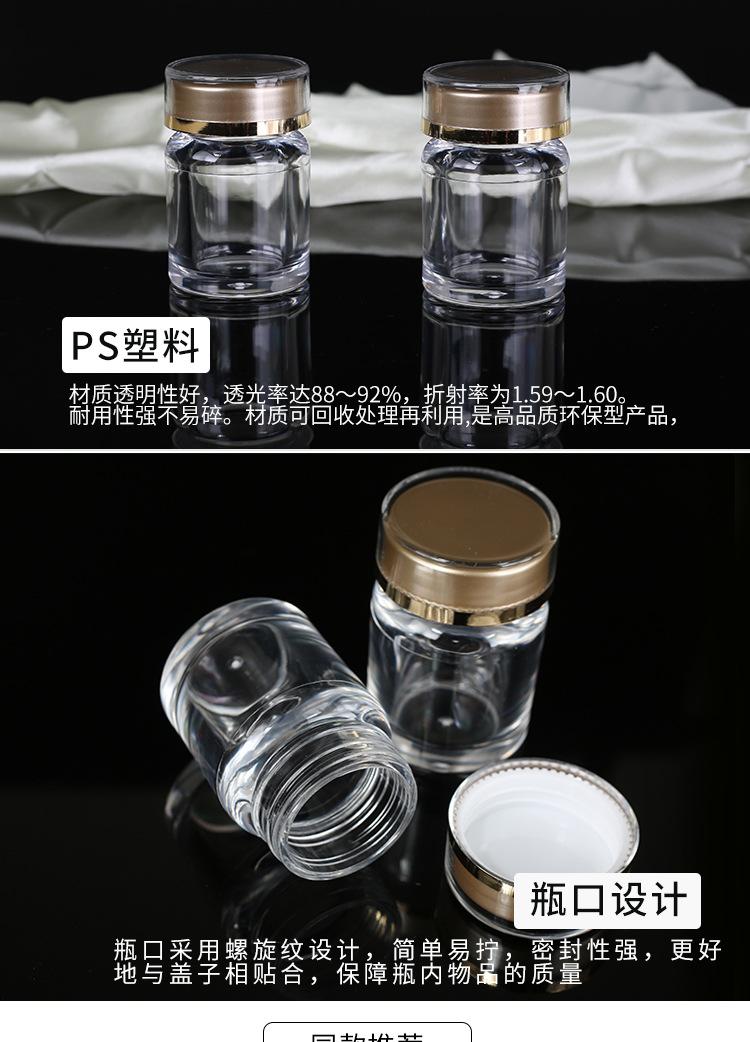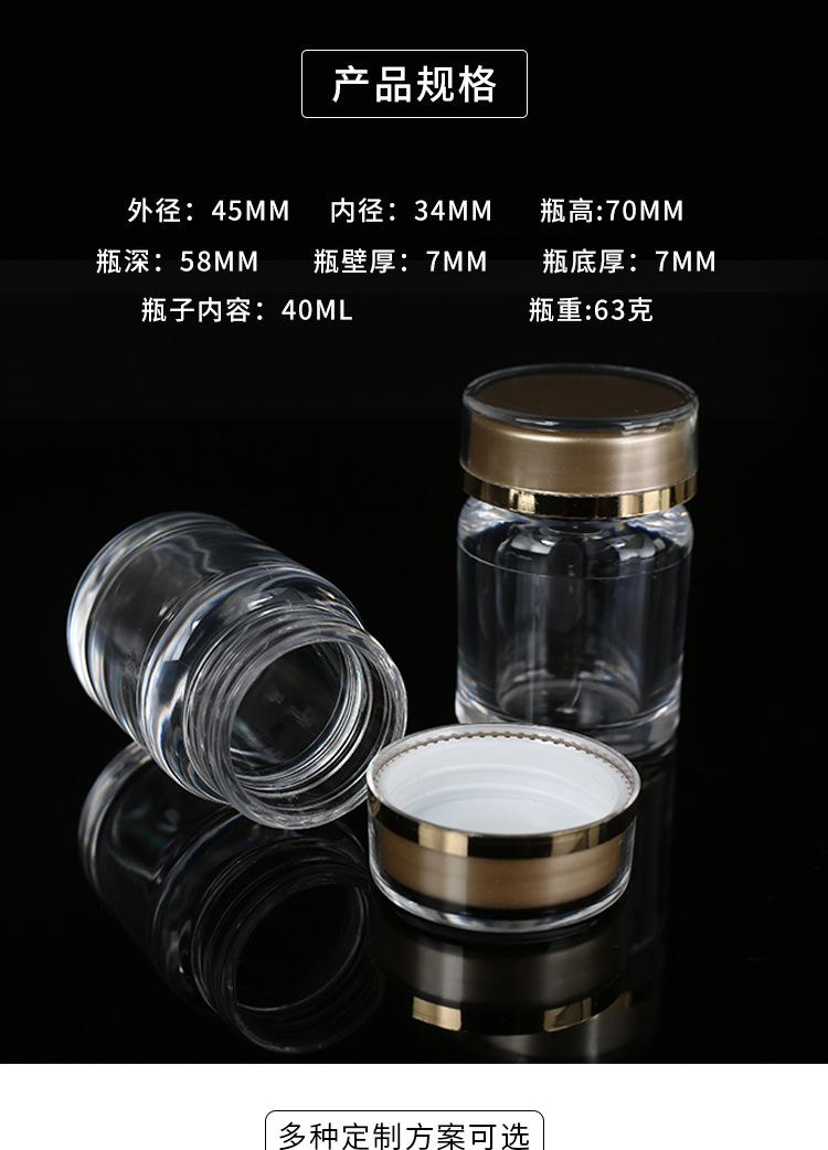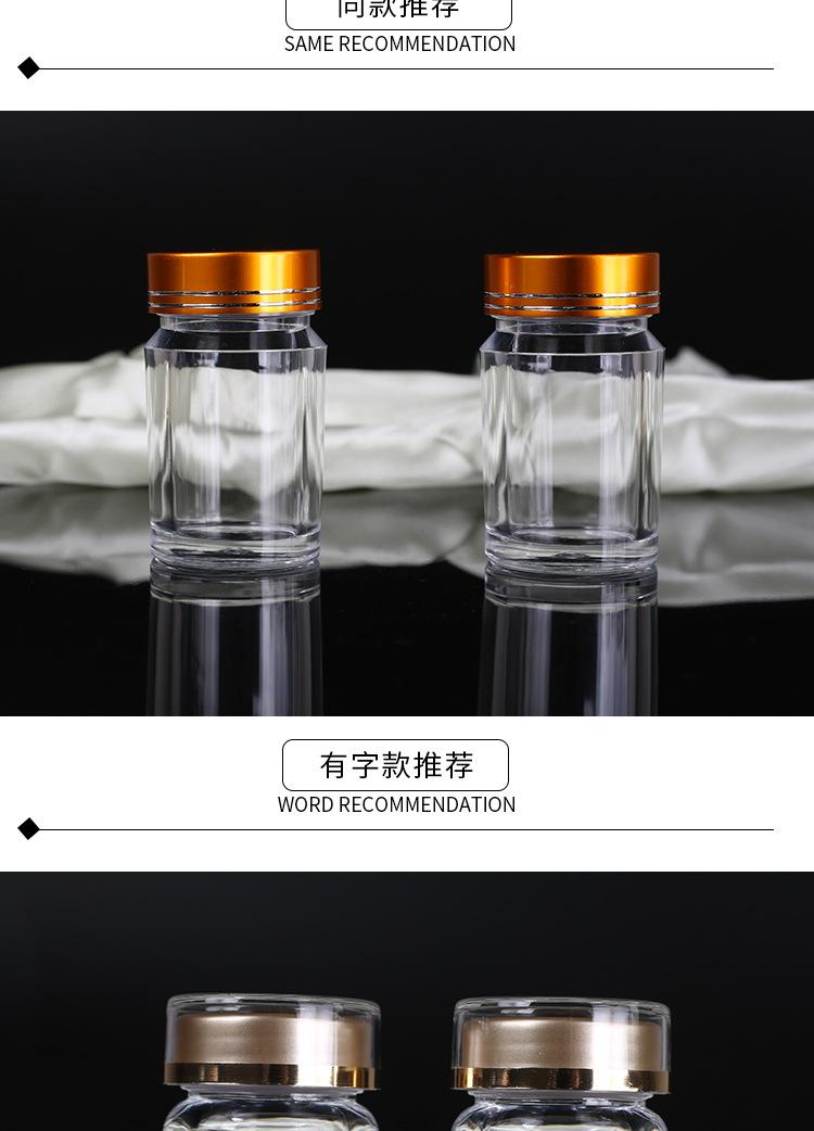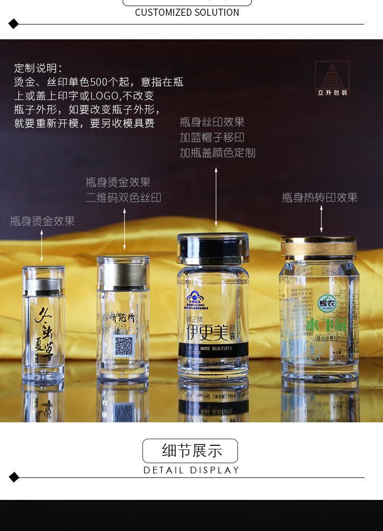 O frasco de embalagem é feito de material de qualidade alimentar e pode ser usado para embalar uma grande variedade de produtos, geralmente cápsulas de saúde, comprimidos, açafrão,