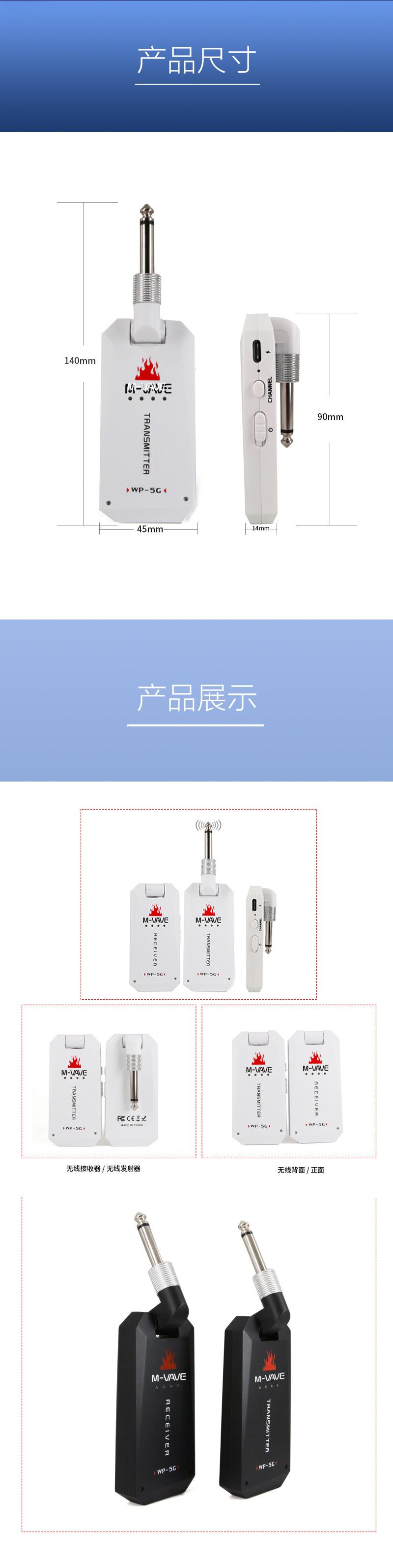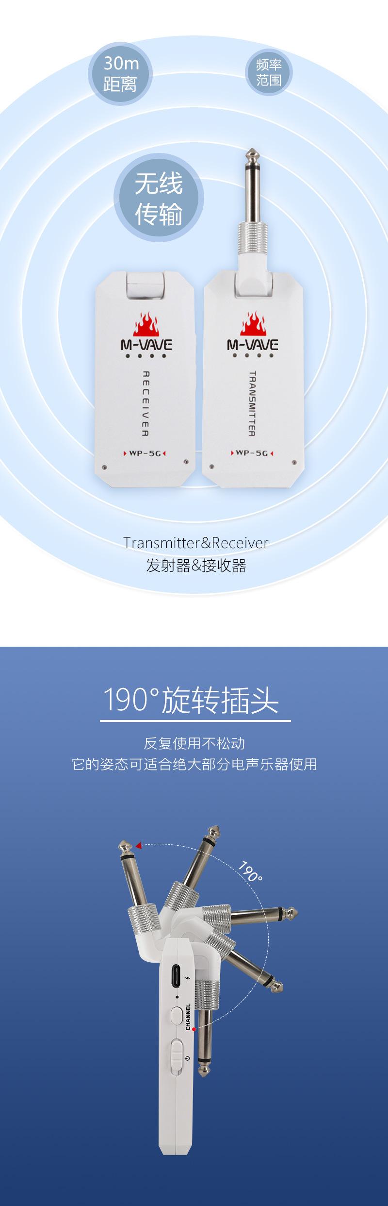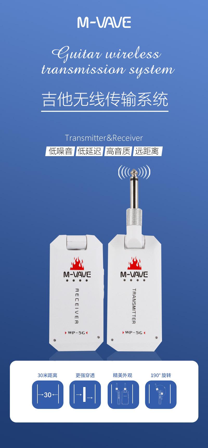 El Sistema de Transmisión Inalámbrica para Guitarra M-VAVE 3ª Generación (Versión Mejorada) WP-5G es un dispositivo especialmente desarrollado para la conexión inalámbrica de guitarras eléctricas. Hemos hecho todo lo posible para presentarle este dispositivo inalámbrico de bajo ruido y baja latencia con alta resolución de calidad de sonido (48KHz) y una distancia de transmisión efectiva ultralarga.