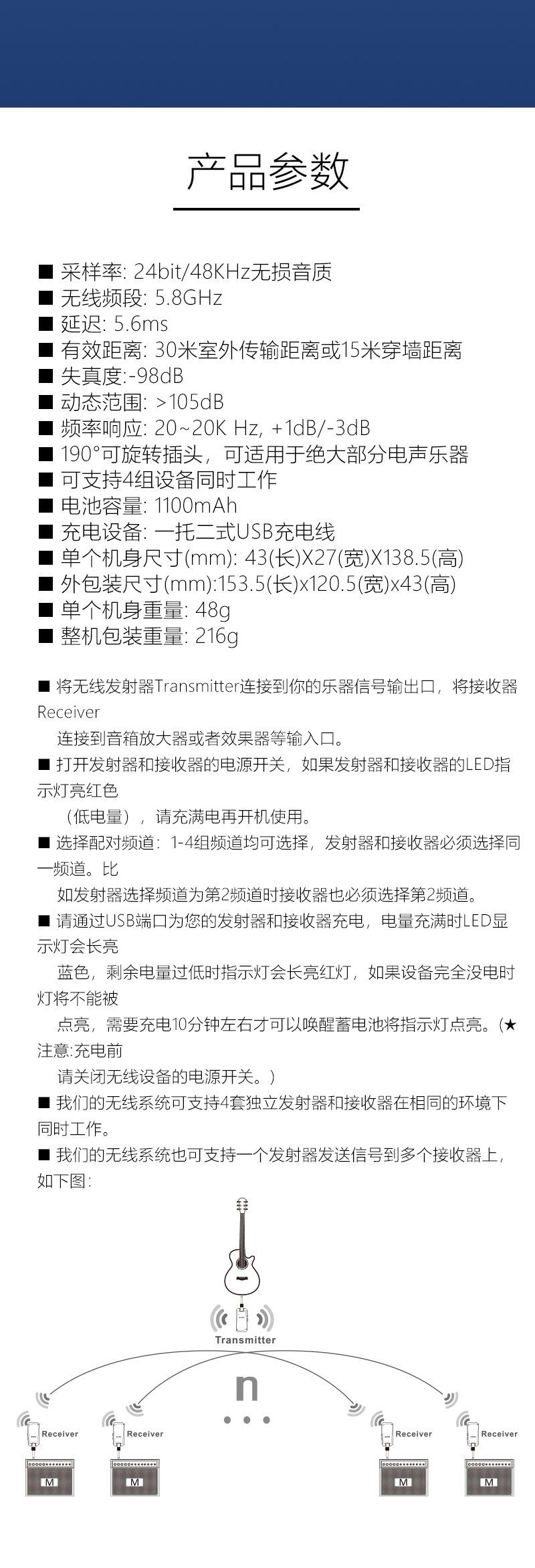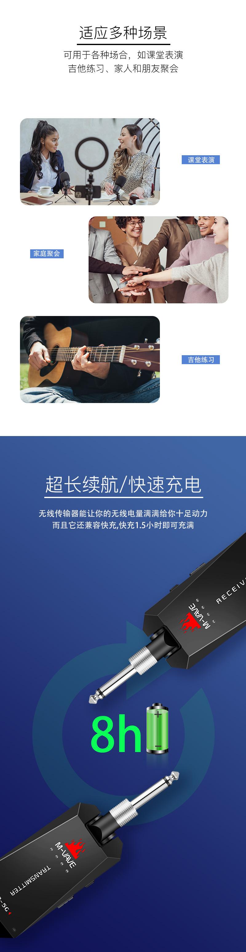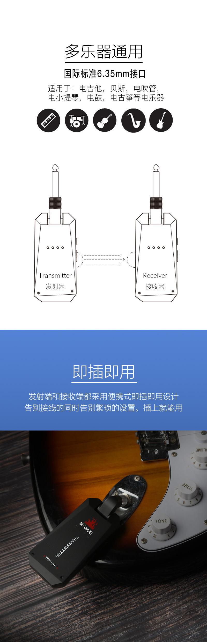 El Sistema de Transmisión Inalámbrica para Guitarra M-VAVE 3ª Generación (Versión Mejorada) WP-5G es un dispositivo especialmente desarrollado para la conexión inalámbrica de guitarras eléctricas. Hemos hecho todo lo posible para presentarle este dispositivo inalámbrico de bajo ruido y baja latencia con alta resolución de calidad de sonido (48KHz) y una distancia de transmisión efectiva ultralarga.