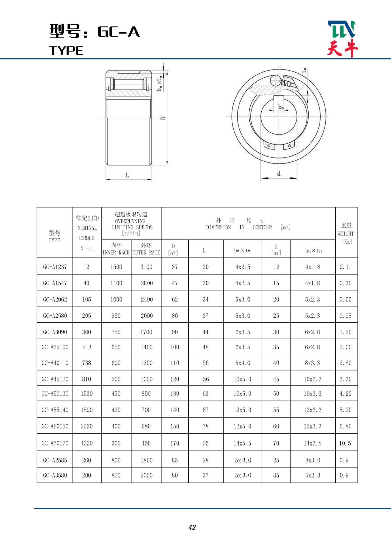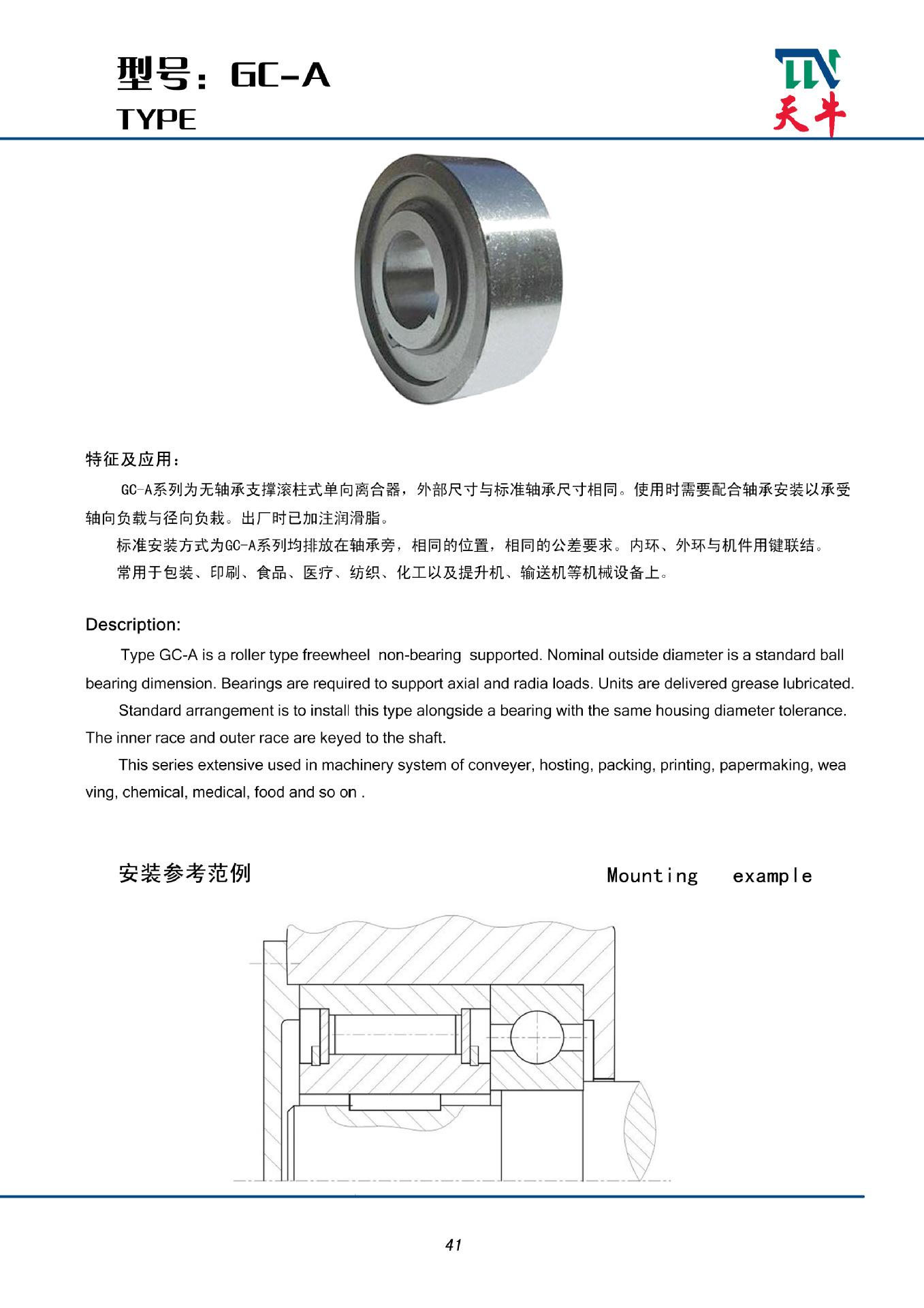 A série GC-A é uma embreagem unidirecional do tipo rolo sem suporte de rolamento. As dimensões externas são as mesmas das dimensões do rolamento padrão. Ela precisa ser instalada com um rolamento para suportar cargas axiais e radiais. A graxa é adicionada na fábrica. O método de instalação padrão é que a série GC-A seja colocada ao lado do rolamento, na mesma posição e com os mesmos requisitos de tolerância. O anel interno, o anel externo e as peças da máquina são conectados por chaves. É comumente usado em embalagens, impressão, alimentos, médicos, têxteis, indústria química, bem como elevadores, transportadores e outros equipamentos mecânicos.