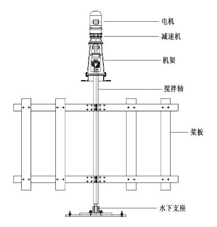 O misturador de estrutura JBK é composto de motor, redutor, estrutura, eixo de agitação, pá, acoplamento, suporte subaquático, etc.