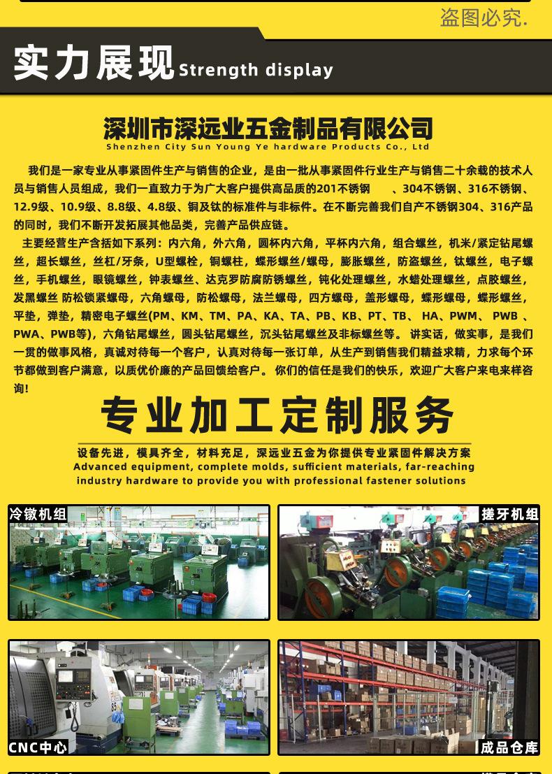 [Parafusos da Indústria Shenyuan] Somos uma empresa especializada na produção e venda de fixadores. Somos compostos por um grupo de técnicos e vendedores que atuam na produção e venda de fixadores há mais de 20 anos. Temos o compromisso de fornecer aos nossos clientes aço inoxidável 201, aço inoxidável 304, aço inoxidável 316, grau 12,9, grau 10,9, grau 8,8, grau 4,8, peças padrão de cobre e titânio e peças não padronizadas de alta qualidade. Enquanto melhoramos constantemente nossos produtos de aço inoxidável 304 e 316 de produção própria, continuamos a desenvolver e expandir outras categorias e a melhorar a cadeia de fornecimento de produtos.