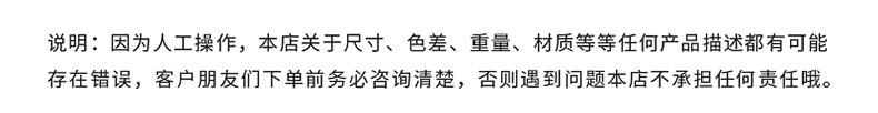 La diferencia de color es inevitable en las compras en línea. Todas las fotos de los productos en esta tienda se toman de objetos reales. Sin embargo, habrá cierta diferencia de color debido a los monitores (especialmente los monitores LCD), las cámaras, la luz solar, etc., lo cual es inevitable en las compras en línea. Haremos todo lo posible para explicarlo en los artículos. Por favor, comprenda que el color de todos los productos está sujeto al producto real. Si es muy sensible al color o tiene poca imaginación, no lo compre. Si tiene dudas, consulte los comentarios de otros compradores o comuníquese con nuestro servicio de atención al cliente de preventa antes de decidirse a comprar. Asegúrese de verificar el tamaño del producto cuidadosamente antes de disparar, porque el método de medición de todos es suelto o apretado, y el error de 1-3 cm está dentro del rango normal. Por favor, comprenda. La diferencia de color, la ligera diferencia de tamaño y otros problemas como diferentes de su imaginación no se utilizarán como base para reseñas medias o malas. Si tiene alguna pregunta, comuníquese antes de disparar, ¡gracias!