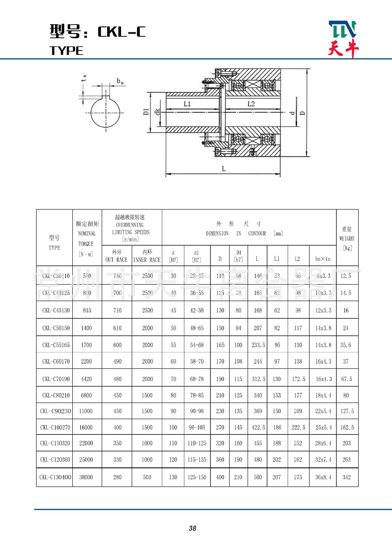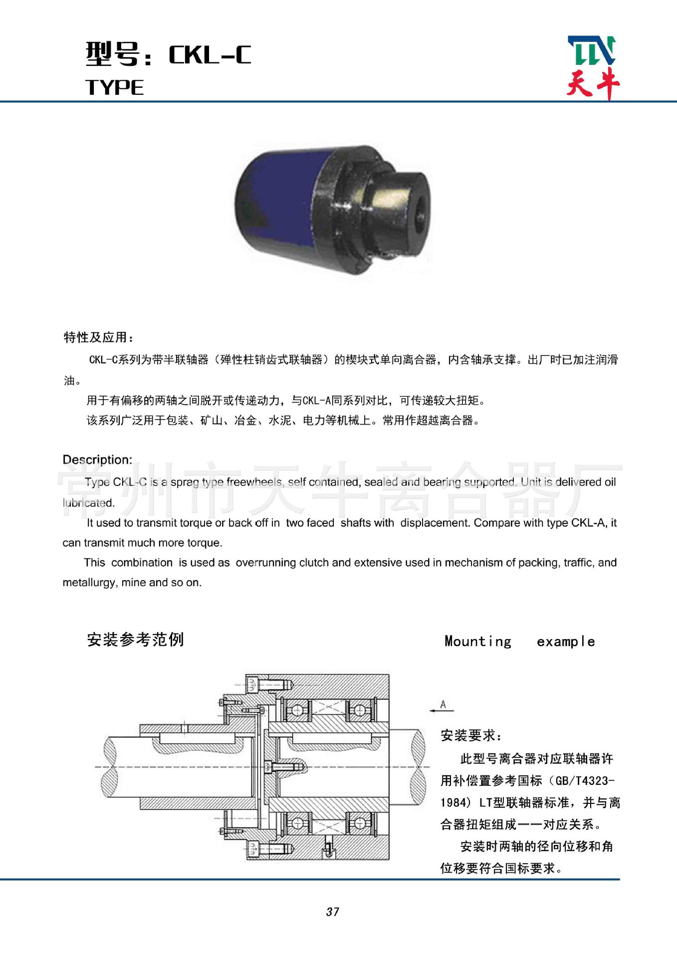 A série CKL-C é uma embreagem unidirecional do tipo cunha com meio acoplamento (acoplamento elástico pino-dente) e um suporte de mancal. Ela é preenchida com óleo lubrificante na fábrica.