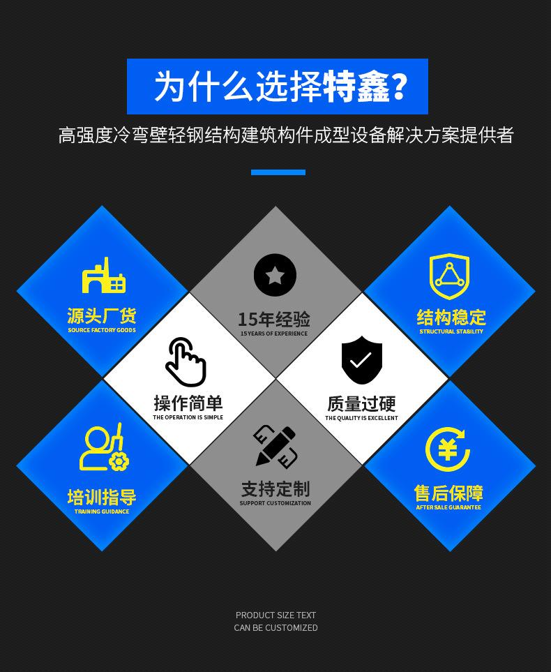 Os principais produtos da Foshan Texin Machinery Equipment Co., Ltd. são: equipamentos de conformação a frio de metais, equipamentos de estrutura de aço, máquinas de persianas, máquinas de aço em formato C, Z, U, V, W, máquinas de ladrilhos com fivela oculta, máquinas de ladrilhos de aço coloridos, máquinas de guarda-corpos de rodovias, máquinas de prateleiras, máquinas de painéis de vagões, máquinas de painéis de contêineres, máquinas de acessórios para refrigeradores, máquinas de quilha, máquinas de pisos, máquinas de caixilhos de portas, máquinas de portas e janelas antirroubo, máquinas de ranhuras para estufas, máquinas de portas rolantes compostas europeias, máquinas de colunas de prateleiras, máquinas de ladrilhos esmaltados de aço coloridos, máquinas de fivelas de teto, máquinas de quilhas de aço leve, máquinas de painéis de telhado com fivela oculta, máquinas de pisos, máquinas de trilhos de guia de esferas, máquinas de tubos com formatos especiais, vários equipamentos de dobra a frio de chapas metálicas com formatos especiais, etc.