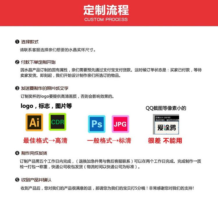 | Serviços personalizados | Troféus de cristal, medalhas de cristal, placas de cristal para pendurar, pratos de cristal para prêmios, pratos de cristal para autorização, entalhes internos de cristal, modelos de cristal, bolas de cristal, tripés de cristal, porta-canetas de cristal, réguas de cristal, chaveiros de cristal, enfeites de cristal e outros artesanatos de cristal estão todos disponíveisSpot semi-personalizadoPara um estilo totalmente personalizado, entre em contato com o atendimento ao cliente on-line para obter o serviço. |