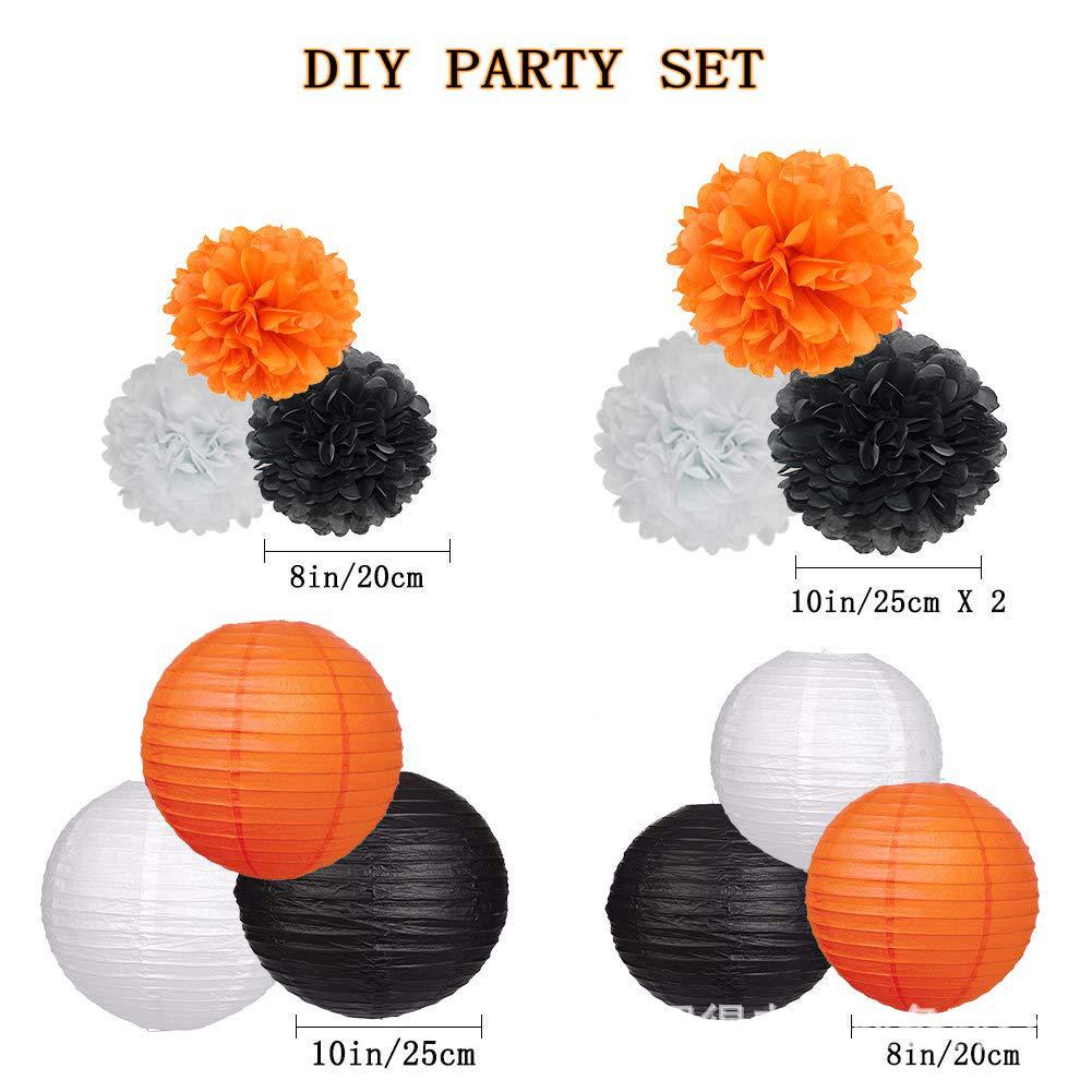 Bola de flor de papel: 2 blancas de 10 pulgadas + 2 naranja oscuro de 10 pulgadas + 2 negras de 10 pulgadas + 1 blanca de 8 pulgadas + 1 naranja oscuro de 8 pulgadas + 1 negra de 8 pulgadas