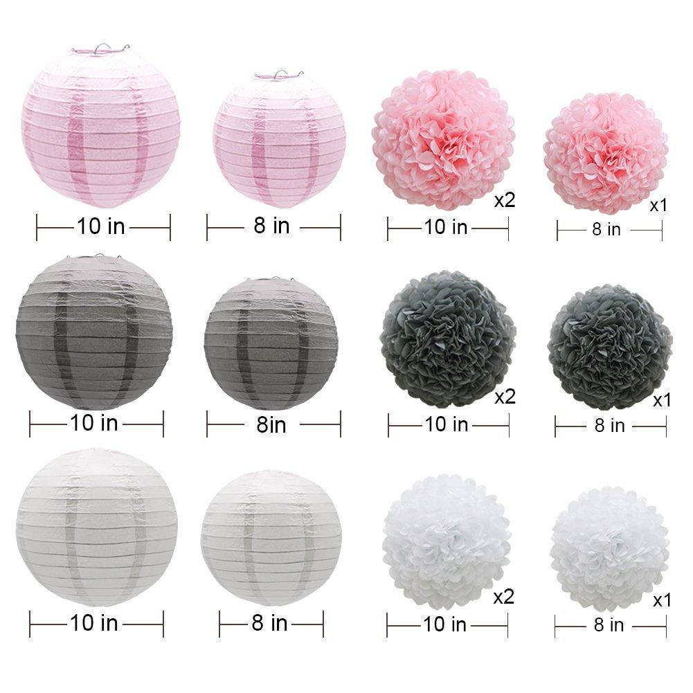 Linterna de papel: 10 pulgadas blanca + 10 pulgadas rosa claro + 10 pulgadas gris claro + 18 pulgadas blanca + 18 pulgadas rosa claro + 18 pulgadas gris claro
