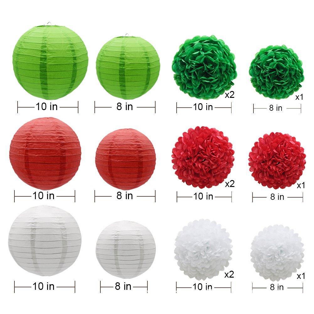 Faroles de papel: blanco de 10 pulgadas + rojo de 10 pulgadas + verde oscuro de 10 pulgadas + blanco de 18 pulgadas + rojo de 18 pulgadas + verde oscuro de 18 pulgadas
