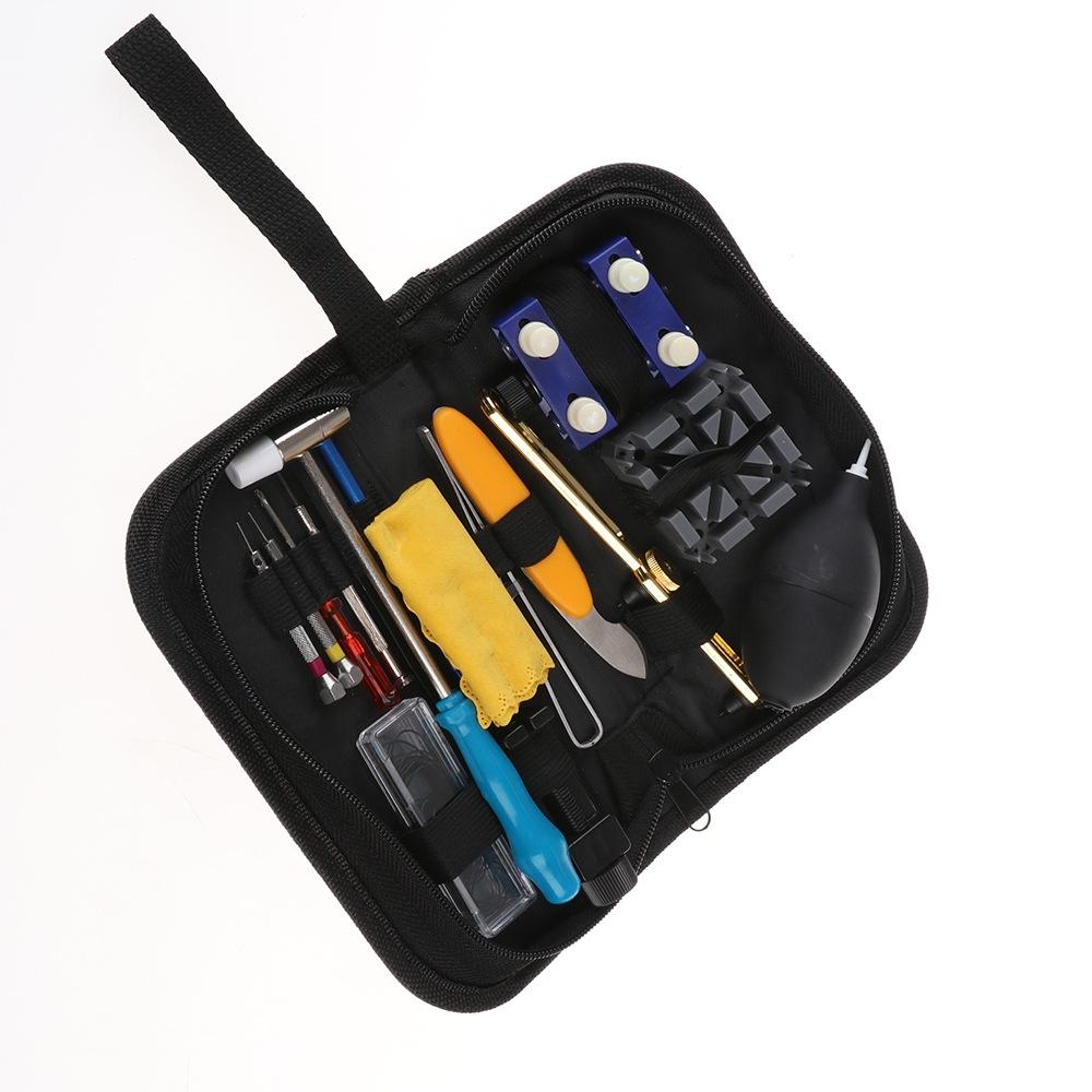 O conjunto inclui: um pano amarelo para óculos, um pequeno martelo com cabo azul, um suporte de relógio azul, um removedor de pulseira de plástico preto, uma bola preta para remoção de poeira, um removedor de tampa dupla dourada, um removedor de agulhas prateado, uma faca amarela para abrir conchas, um suporte Pozidriv cinza, uma pinça preta de aço inoxidável, um garfo de orelha azul de cabeça única, uma chave de fenda Phillips vermelha, uma chave de fenda Phillips prateada, dois punções de pulseira de relógio prateados e uma caixa com 20 anéis à prova d'água para tampa traseira de relógio de 18-38 mm (diâmetro interno do anel à prova d'água).