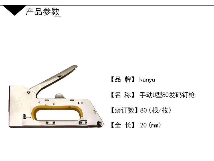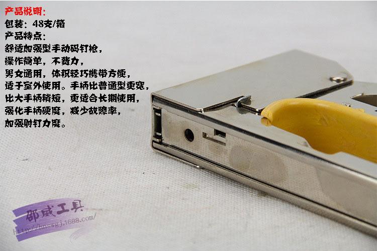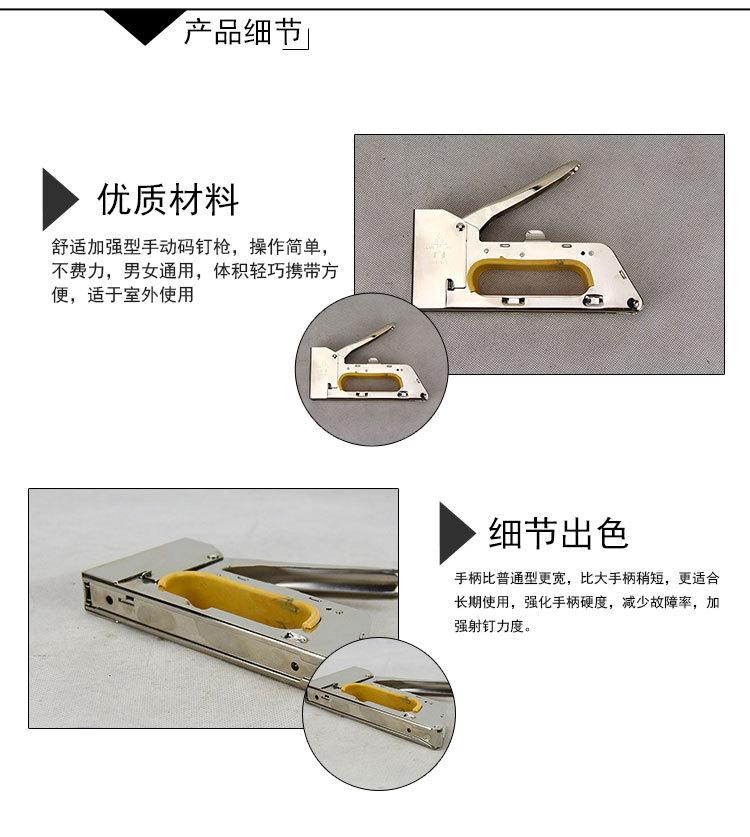 - Características do produto: Pistola de pregos manual confortável e aprimorada, fácil de operar, sem esforço, adequada para homens e mulheres, leve e fácil de transportar, adequada para uso externo. O cabo é mais largo do que o tipo comum e ligeiramente mais curto do que o cabo grande, mais adequado para uso a longo prazo, e a dureza do cabo é aprimorada para reduzir a taxa de falhas e aumentar a força de disparo do prego.