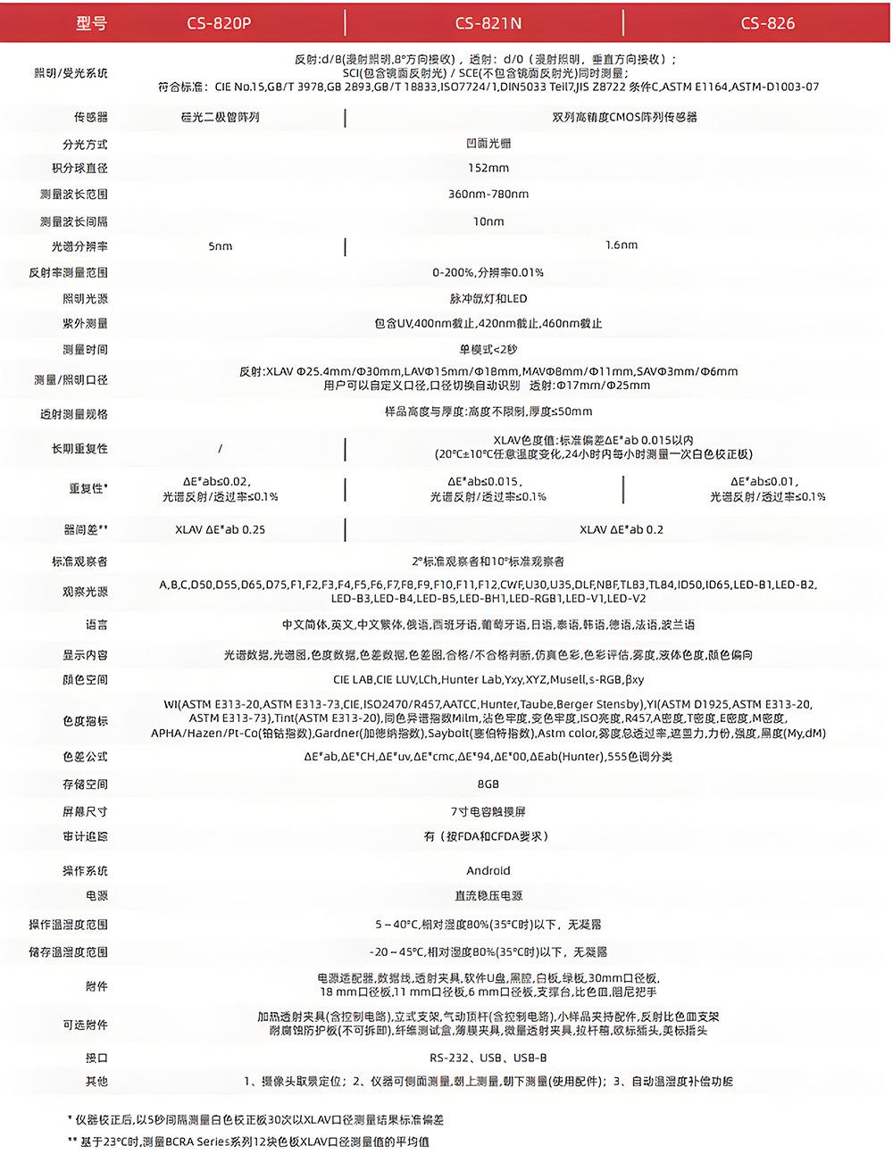 O CS-820N é um espectrofotômetro inteligente e conveniente, adotando uma tela sensível ao toque capacitiva TFT de 7 polegadas com cores verdadeiras, espectro total e sistema operacional Android. Métodos de iluminação: refletância d/8°, transmitância d/0° (incluindo medição UV/excluindo medição UV), com medição de cor precisa e estável, grande capacidade de armazenamento e poderosas funções de expansão no lado do PC, usado para análise de cor e transmissão em laboratório.O CS-821N possui uma função de calibração automática que o CS-820N não possui)