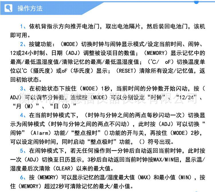 Principais produtos: termômetros de ponteiro e higrômetros, termômetros e higrômetros eletrônicos domésticos, termômetros para alimentos e leite, termômetros de água, termômetros para aquários, termômetros de vidro, termômetros de água vermelha e outros instrumentos de medição de temperatura.