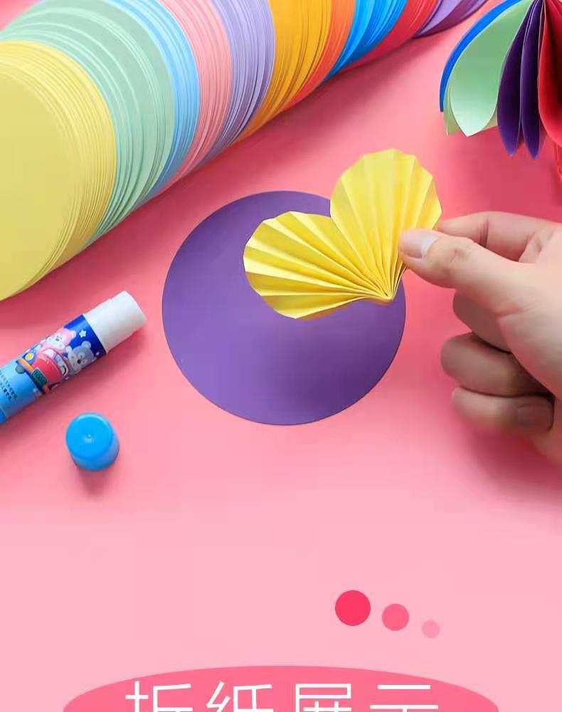 6 grupos de colores, 12 hojas de varias especificaciones, desde diámetros pequeños de 2cm, 4cm, 6cm, 8cm, 10cm, 12cm, 14CM, 72 hojas de papel redondo de varios tamaños;También se dan 10 ojos móviles blancos y negros.