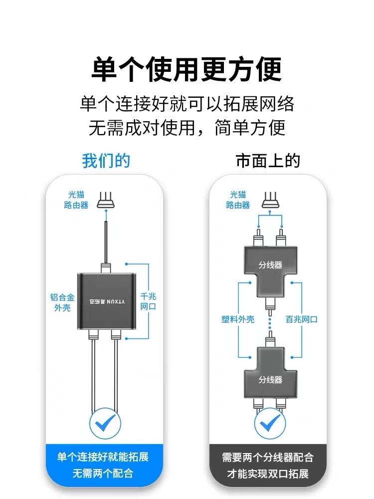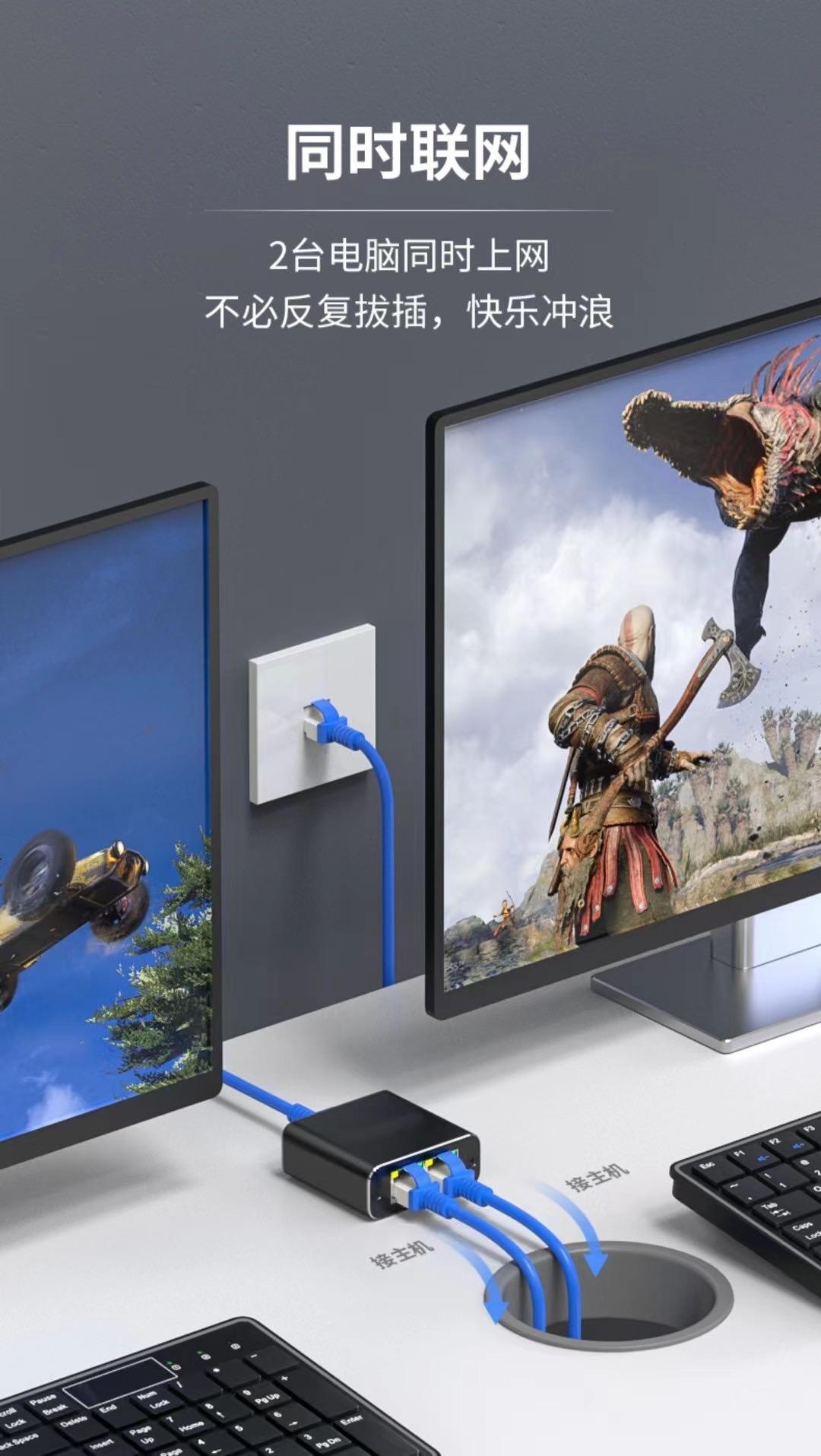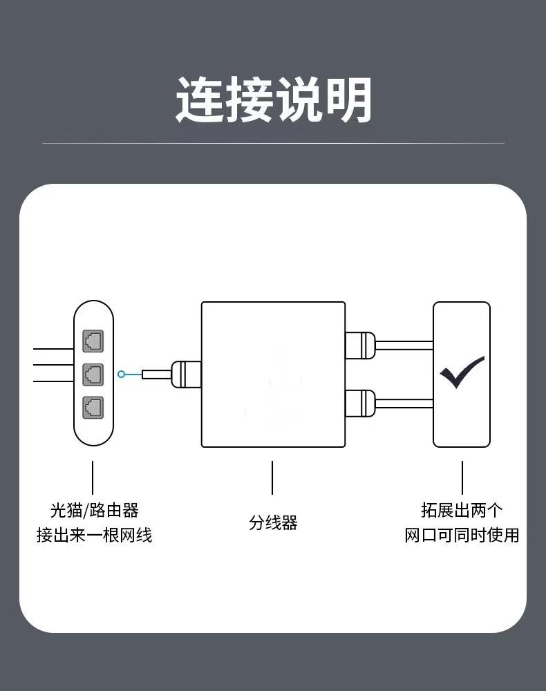 · Vários usos estão esperando você descobrir. O conector de rede de três vias pode realizar a linha livre entre vários dispositivos de rede. Por exemplo, roteador+IPTV, computador+roteador,IPTV+IPTV, roteador+roteador, etc.