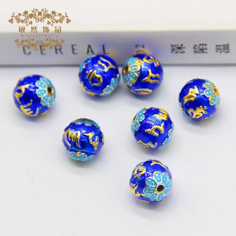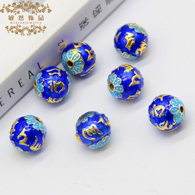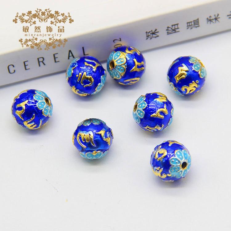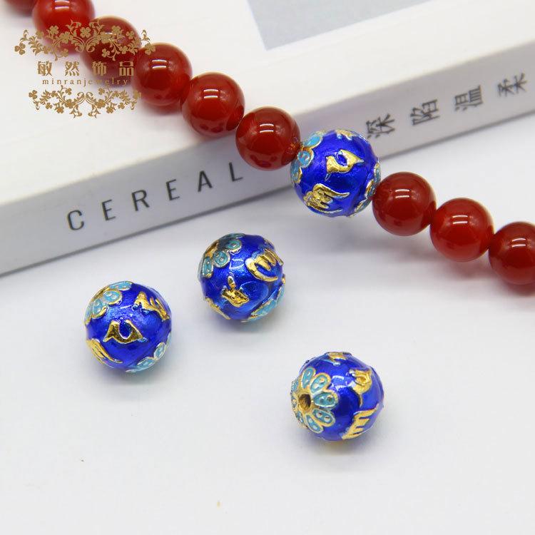 Contas redondas de mantra de seis caracteres azul cobre esmaltado com contas