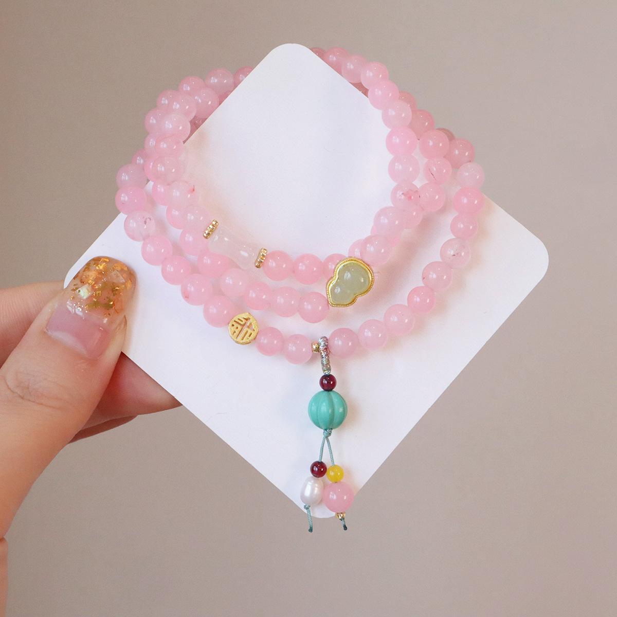 Pulseira de cristal rosa feminina com três círculos de cristal e contas estilo nacional pulseira de flor de pêssego presente de design de nicho para namorada