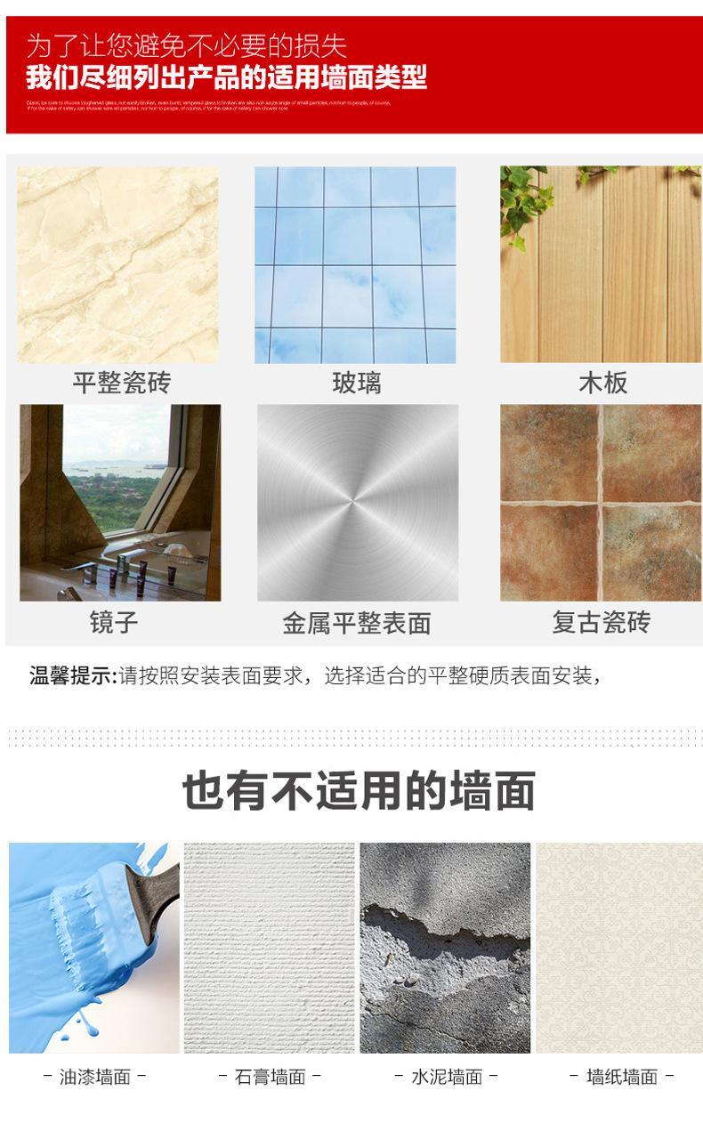 (2) Para instalação sem perfuração, observe que a superfície da parede deve ser plana e sólida, como ladrilhos de vidro.Não disponível emEm paredes irregulares e instáveis, como paredes pintadas, papel de parede, paredes de cal, etc. Depois de aplicar a cola na parede, você precisa esperar de 3 a 5 dias para que a cola sem pregos seque completamente antes de usá-la!