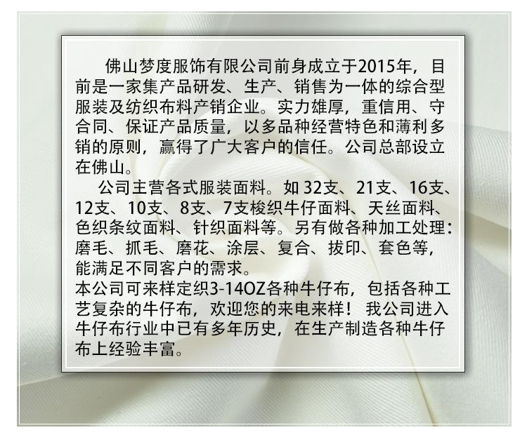 O princípio da vitóriaA empresa conquistou a confiança dos clientes. A empresa está sediada em Foshan. A empresa lida principalmente com vários tecidos de vestuário. Como tecidos denim 32s, 21s, 16s, 12s, 10s, 8s, 7s, tecidos Tencel, tecidos de malha, etc. Além disso, também fazemos vários processamentos: lixamento, tufagem, moagem, revestimento, laminação, impressão, combinação de cores, etc., para atender às necessidades de diferentes clientes. A empresa pode tecer vários tecidos denim de 3-14OZ de acordo com amostras, incluindo vários processos complexos.Denim, bem-vindo para nos ligar para amostras! Nossa empresa está na indústria de denim há muitos anos e tem uma rica experiência na produção de todos os tipos de denim.