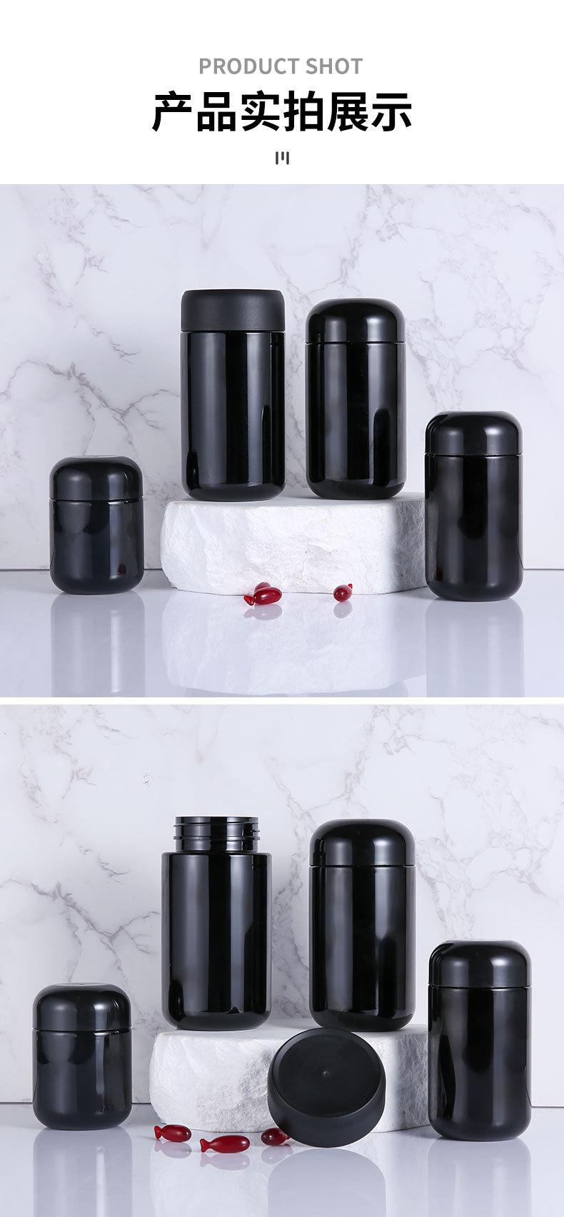 Frasco de cápsula preta, frasco de plástico para animais de estimação, frasco de cuidados de saúde, comprimido de qualidade alimentar, sub-frasco de doces, frasco de remédio, frasco de embalagem