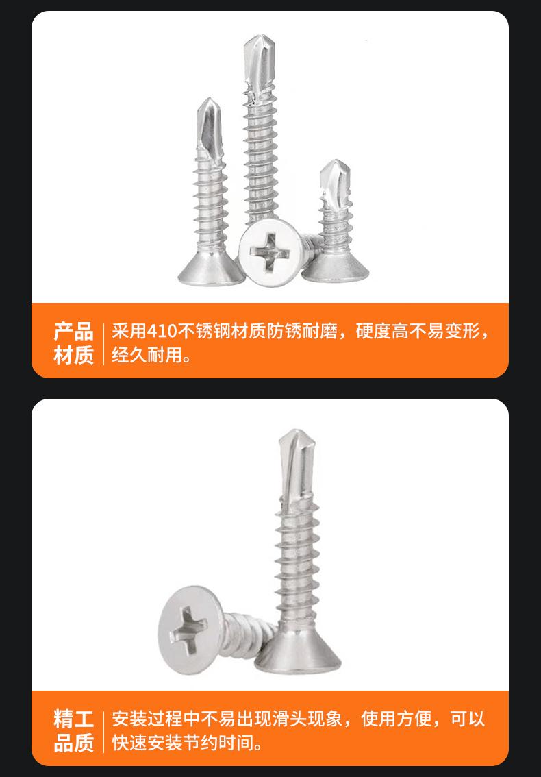 Parafusos de Aço Inoxidável 410 com Ponta Perfurante, Parafusos Autoatarraxantes Autoperfurantes de Cabeça Escareada, Parafusos de Cabeça Chata Cruzada com Ponta Perfurante e Rosca Rápida