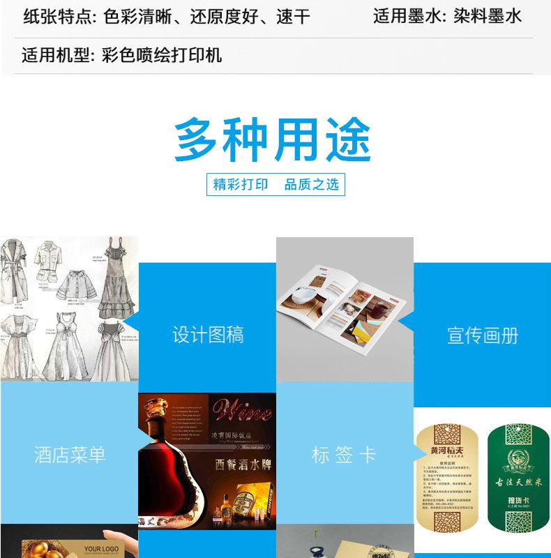 Introdução do produto: Com papel base como substrato, impressão traseira, alta brancura e cor podem refletir tons ricos e coloridos; extraordinária clareza de imagem e saturação de cor; alta velocidade de secagem; amplamente utilizado em Epson, HP, Canon e outras impressoras jato de tinta à base de pigmentos ou corantes à base de água, imagens de alta qualidade podem atingir efeitos de saída fotográfica profissional.