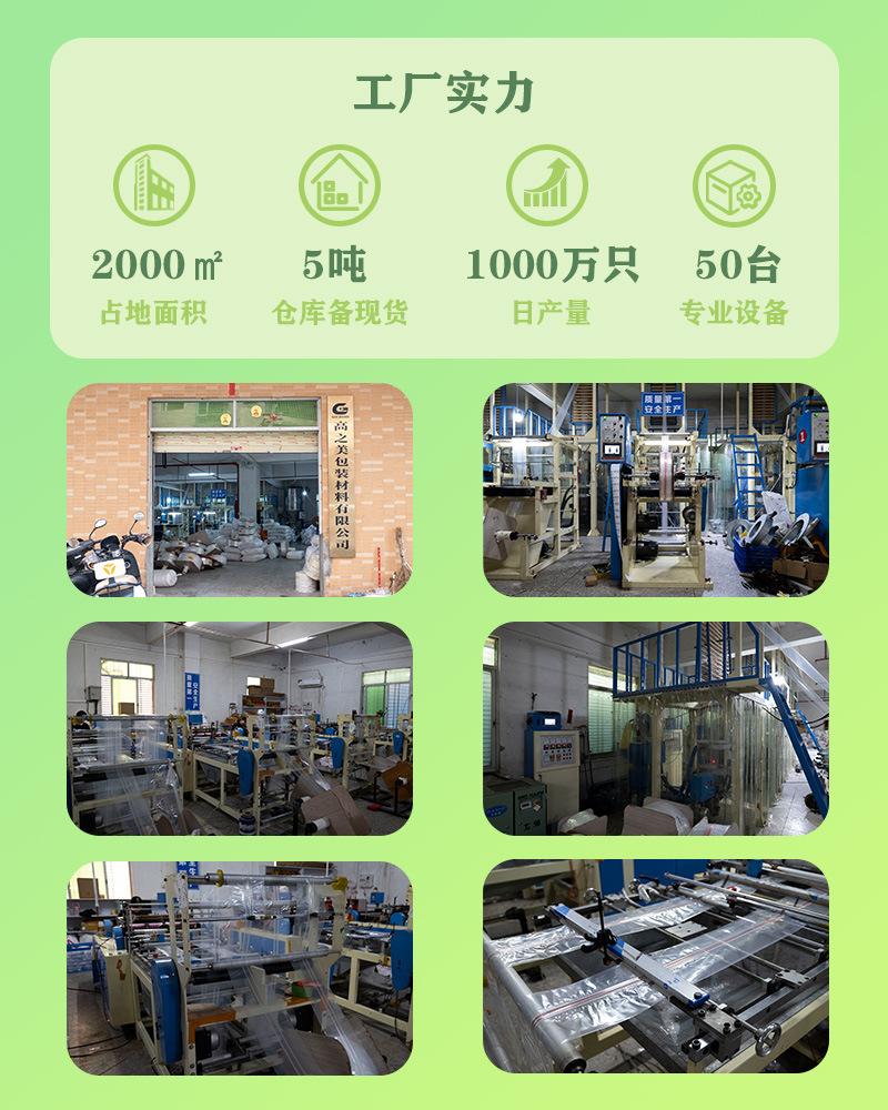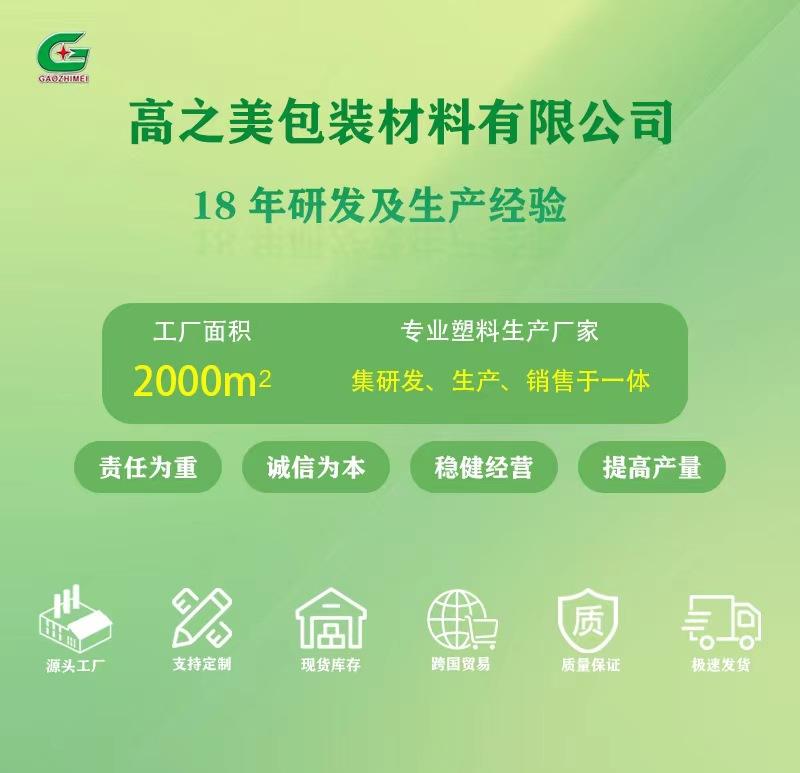 A Gaozhimei Packaging Packaging Material Factory foi fundada em 2006, com 18 anos de experiência em P&D e produção. A fábrica atual cobre uma área de cerca de 2.000 metros quadrados, e o valor da produção está aumentando a cada ano. Sempre foi profissionalmente focada na indústria de embalagens. É um fabricante profissional de plástico que integra P&D, produção e vendas. Produz principalmente sacolas plásticas, sacolas plásticas impressas, produtos de embalagem e outras vendas de suporte. Por meio de inovação contínua e melhor serviço para atender às necessidades do cliente, alcance uma situação ganha-ganha para ambas as partes.