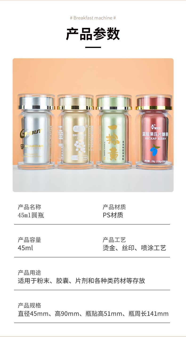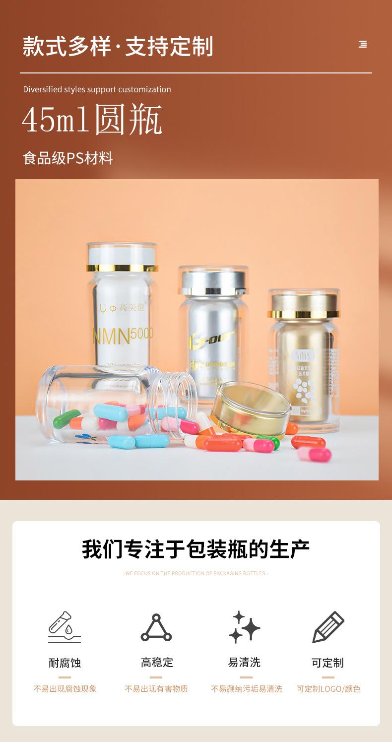 Suministro directo de fábrica 40 ml botella pequeña de medicina botella para cápsulas tableta maca sub-botella material PS transparente botella para producto para el cuidado de la salud