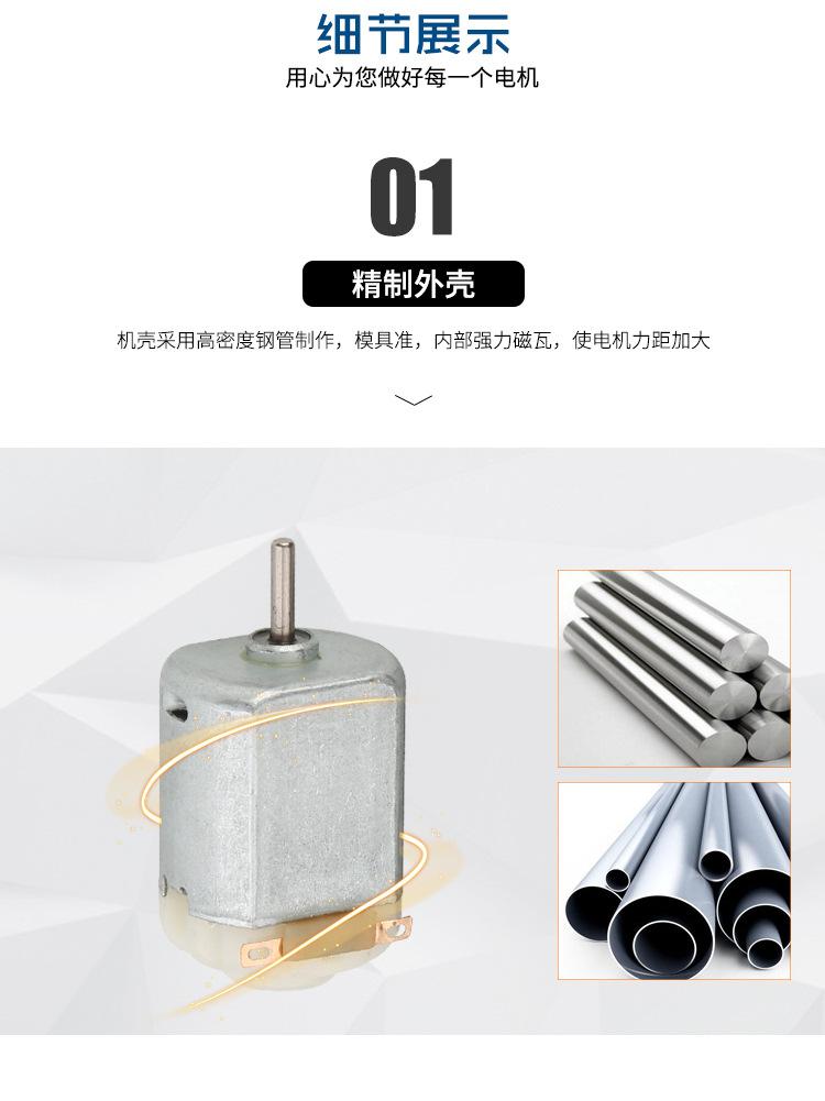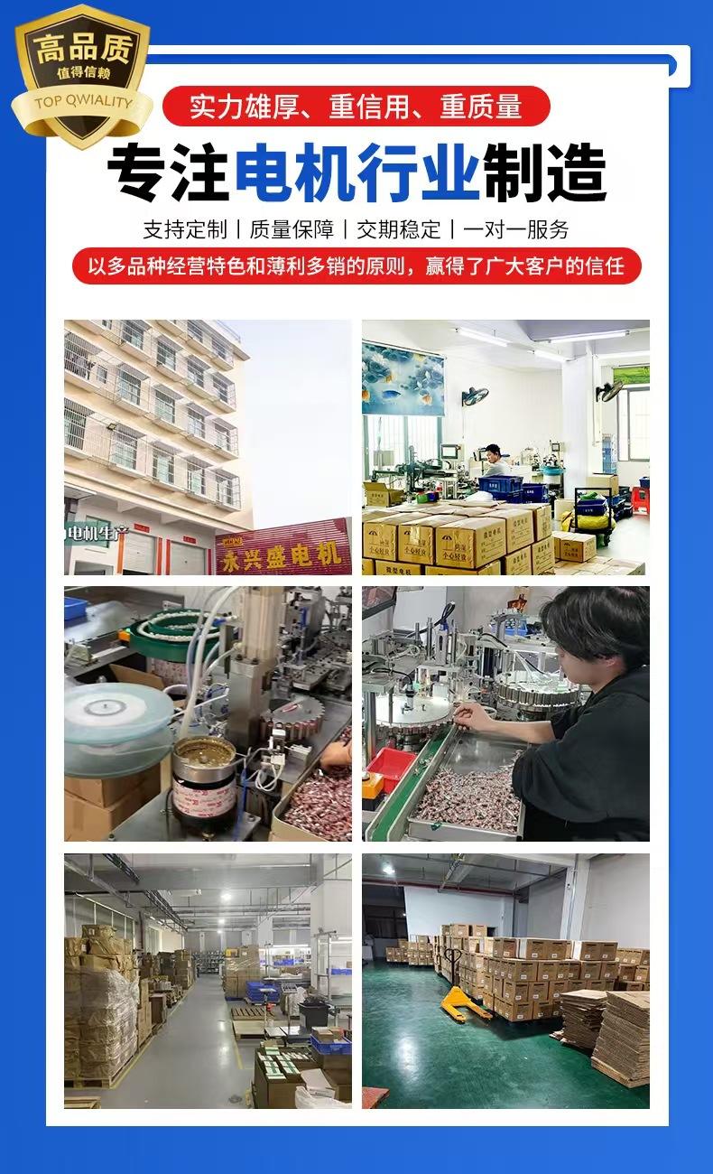 A Jieyang Yongxingsheng Micro Motor Co., Ltd. está localizada na Zona Industrial de Penglin, Rongdong, cidade de Jieyang, leste da província de Guangdong. A empresa ocupa uma área de 3.000 metros quadrados e a área fabril é de 2.400 metros quadrados. A fábrica foi fundada em 1995 e transformada em sociedade anônima em 2004. É especializada na produção de micromotores (FF030, FF/FS130, FF/FS260, FF/FS280), UF020, FFN20, RF-6, RF140, RS/RF260, RF/RS280, RF300, RS360, RS365, RF370, RS380, RS385, RF500, RF530, RS540, RS545, RS550, RS555, RS750, RS755, RS770, RS775) e outras séries. Os produtos são amplamente utilizados em brinquedos elétricos, massageadores, secadores de cabelo e outros eletrodomésticos, bem como em ferramentas elétricas, autopeças e outros setores, com uma capacidade de produção anual de 30 milhões de unidades.Os produtos da empresa são conhecidos por sua alta qualidade, preços acessíveis e entrega pontual, e também desfrutam de uma boa reputação entre a mesma indústria e clientes. E podem projetar, desenvolver e produzir de acordo com os requisitos técnicos do cliente.