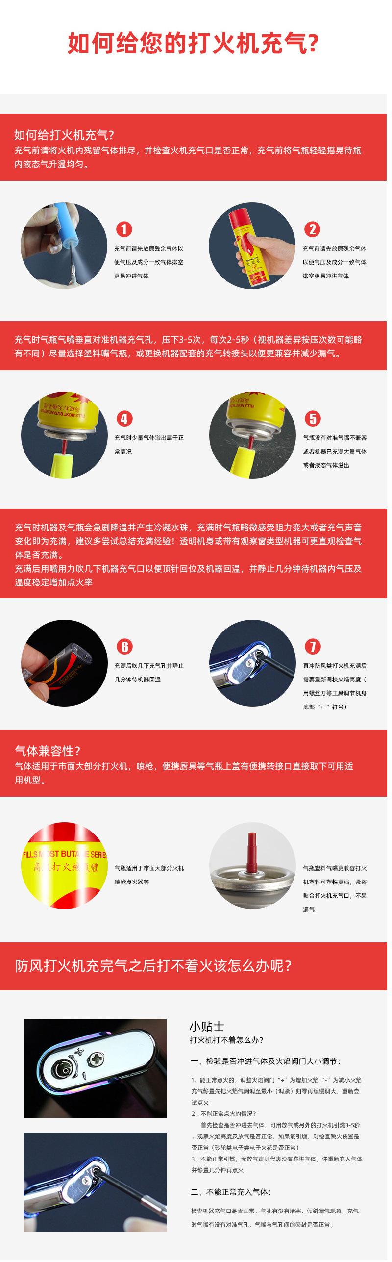 6. Depois de reabastecer todos os tipos de isqueiros, espere pelo menos 1 minuto para ajustar a temperatura do gás recém-abastecido à temperatura ambiente e espere que o gás residual preso na parte externa do isqueiro evapore completamente antes de acender. Se você acender o isqueiro imediatamente neste momento, o gás residual na superfície do isqueiro poderá inflamar, causando perigo desnecessário. Após reabastecer o gás, se a altura da chama estiver muito alta ou muito baixa durante o uso, isso é normal e a altura da chama pode ser ajustada adequadamente.