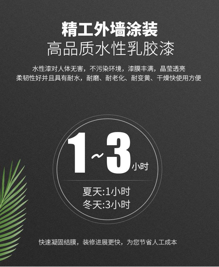 La pintura universal para exteriores es una emulsión acrílica pura producida por nuestra empresa, que se refina con una excelente fórmula. Tiene fuerte resistencia al envejecimiento y a las manchas. El estándar de implementación es GB/T9755-2001.