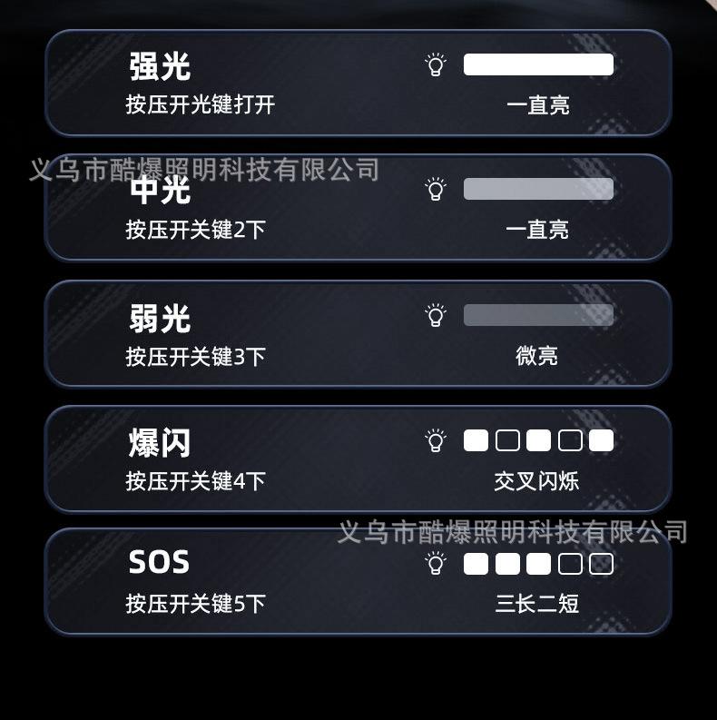 [Engrenagem]: Luz forte - Luz média - Luz fraca - Strobe - SOS (Pressione e segure para desligar)