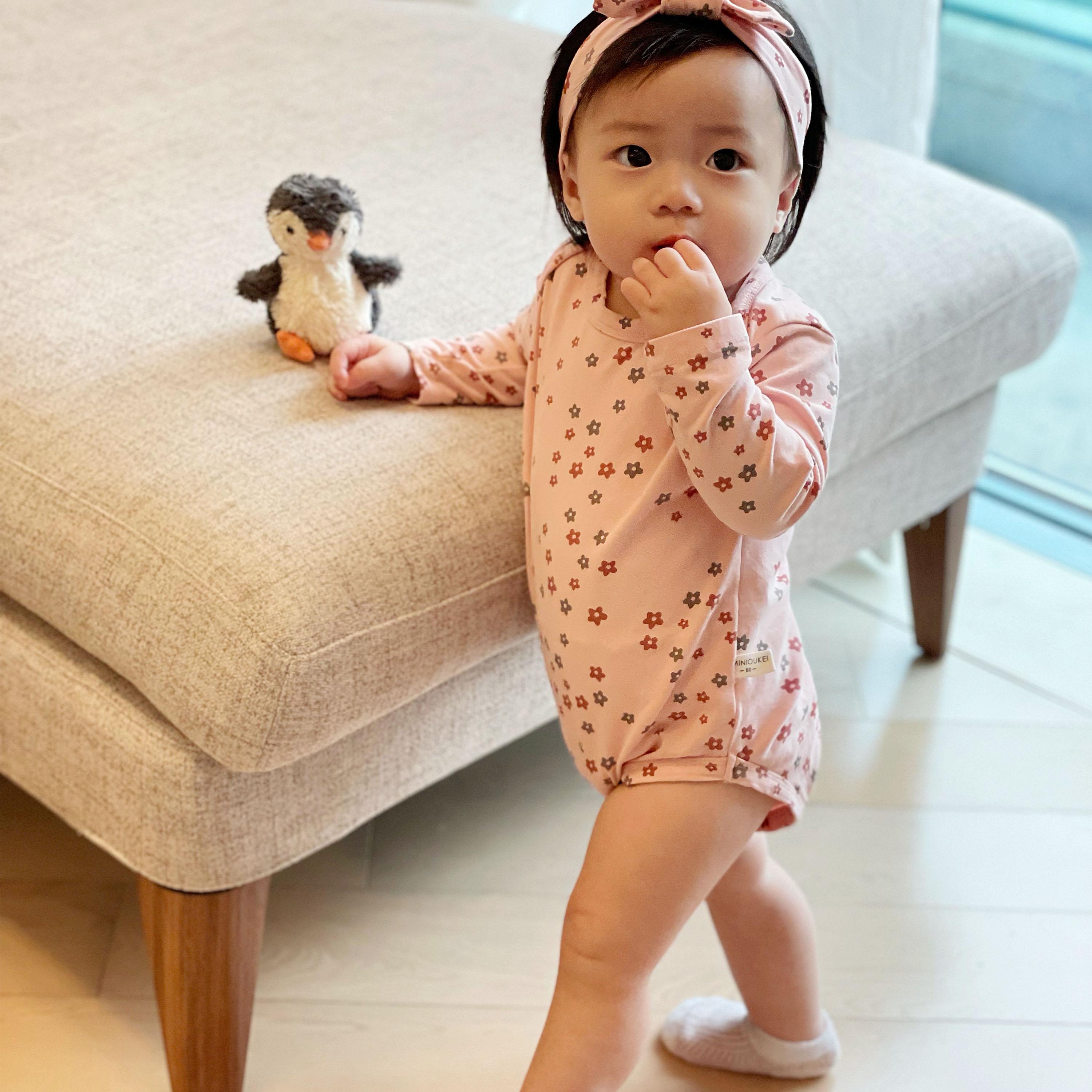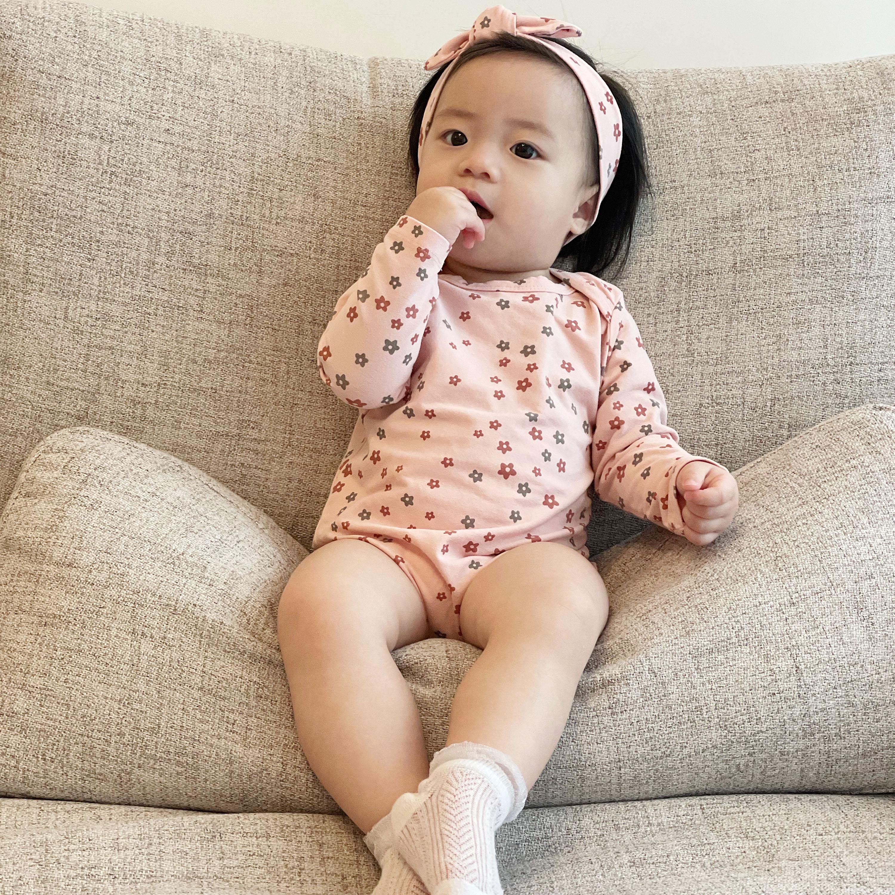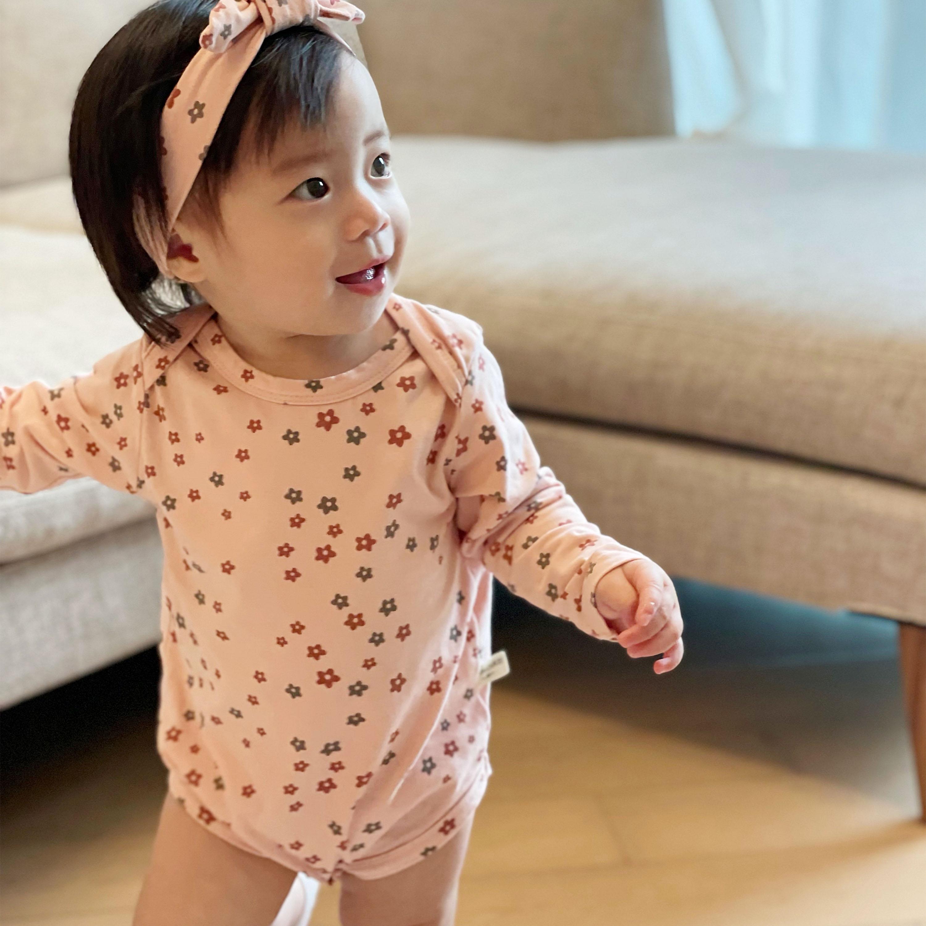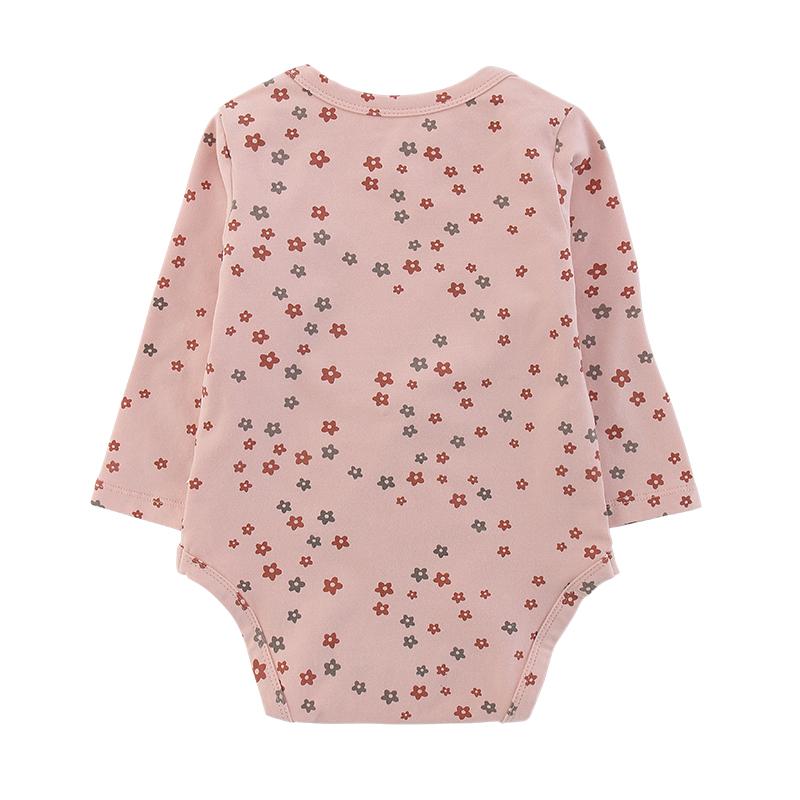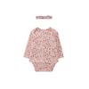 Body triangular de manga comprida com estampa completa de flores pequenas rosa e acessórios para cabelo